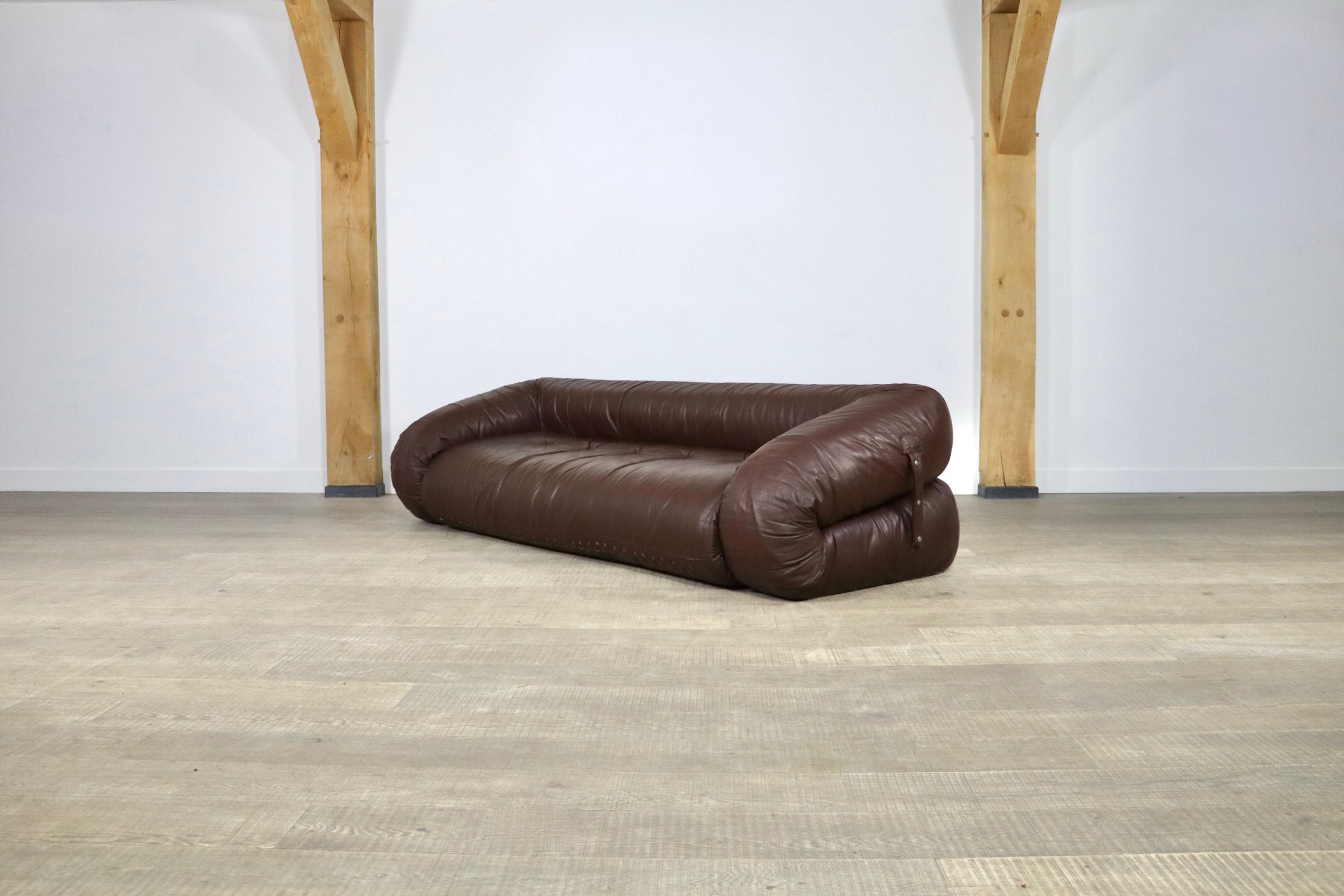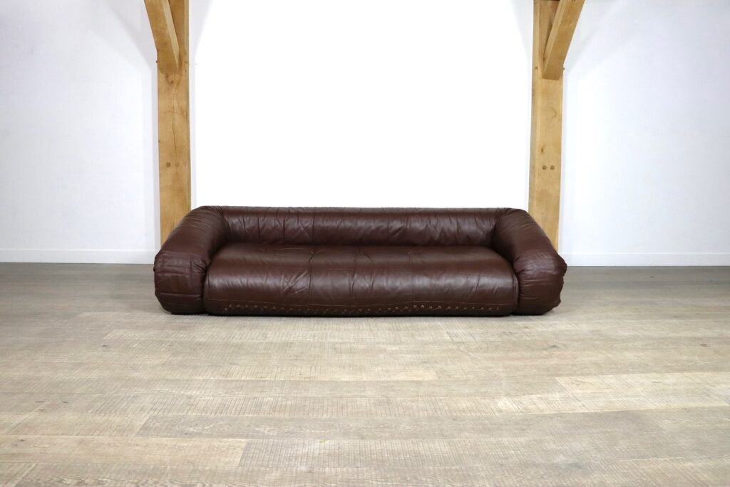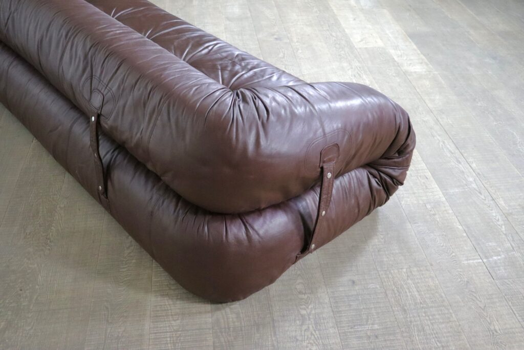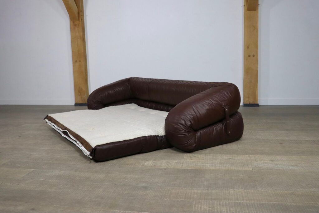 Incredible Anfibio sofa bed by Alessandro Becchi for Giovanetti Collezione Italy 1971. This stunning original brown leather upholstery fits perfectly with the white teddy fabric on the mattress inside. The sofa can easily be converted into a bed, or lounge bed. Ideal for when guests stay over or as a playbed for children.