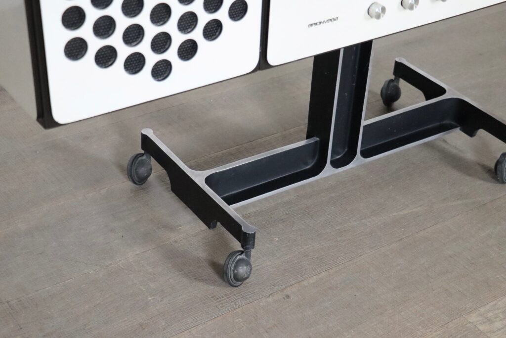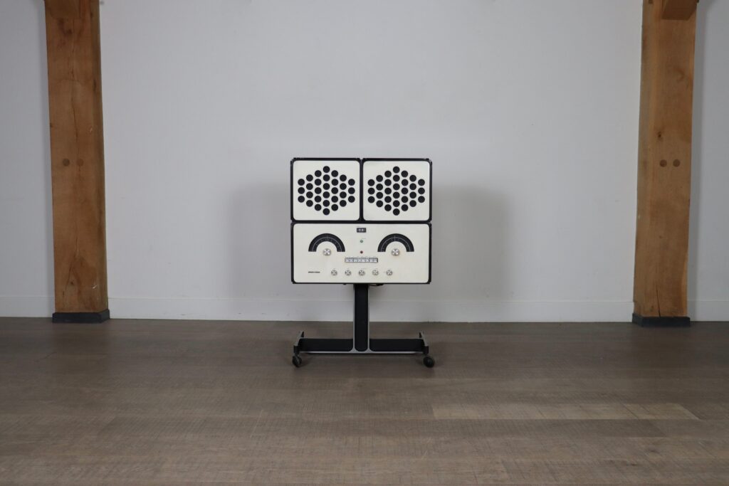 This one is made of white veneer and manufactured by Brionvega, Milan, in the 1960s. The loudspeaker boxes can be hinged to the sides, put above the record player or positioned in the room. Its wood cabinet and speakers are made by hand, which is why no two pieces are exactly identical.
