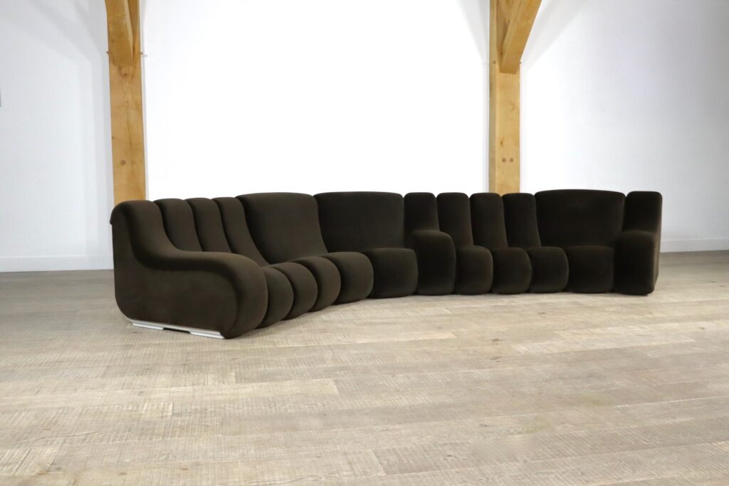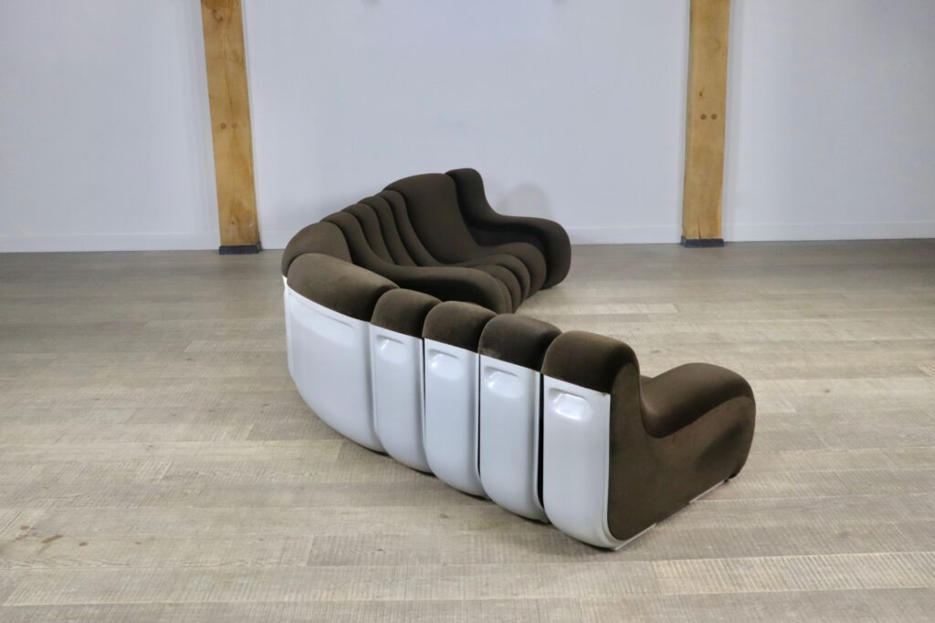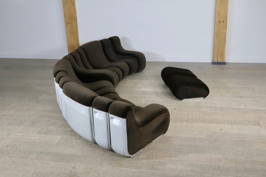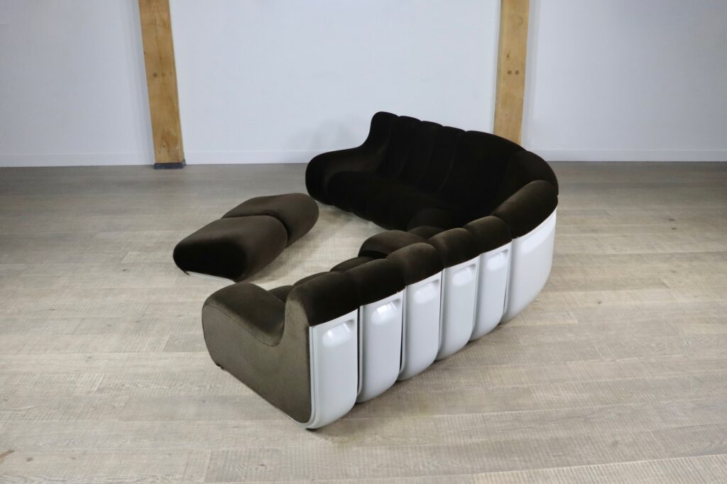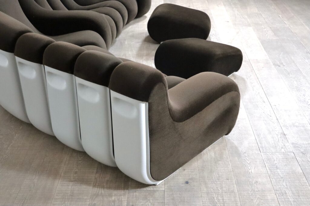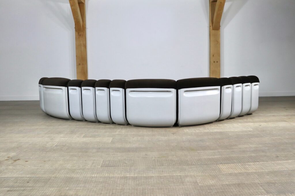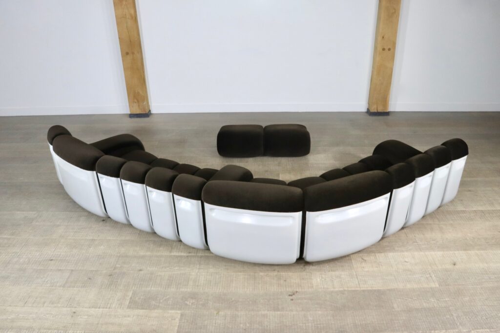 The sofa consists out of 12 seating elements and two ottomans. The beautiful original dark brown mohair velvet upholstery combines nicely with the white fiberglass frames/ backs. Every single one of the frames have grips in the backs perfect for rearranging the parts of the sofa easily. With this one of a kind seating group any space will be unique!