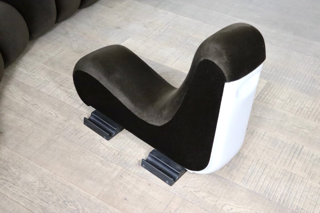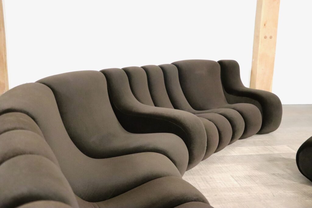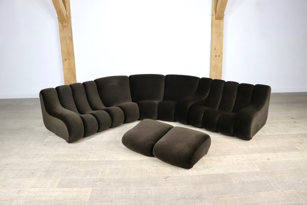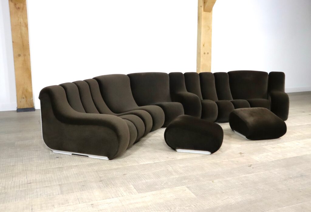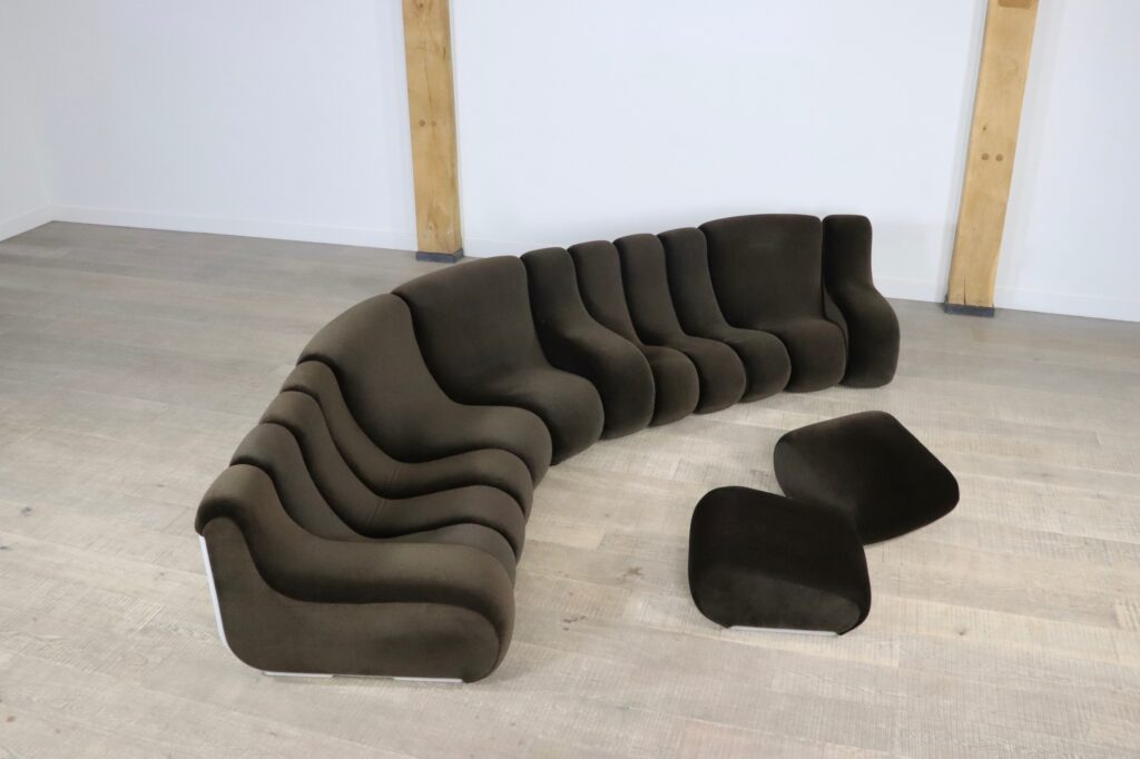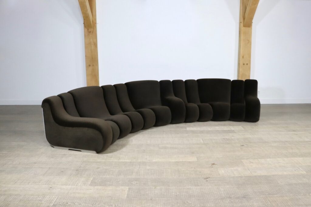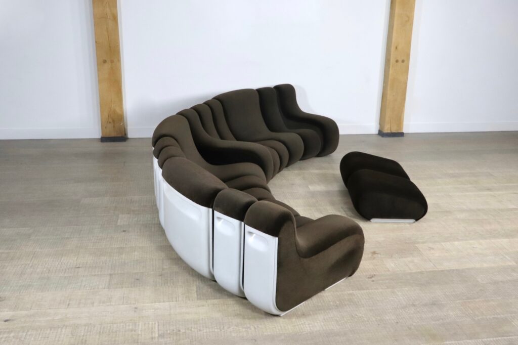 The sofa consists out of 12 seating elements and two ottomans. The beautiful original dark brown mohair velvet upholstery combines nicely with the white fiberglass frames/ backs. Every single one of the frames have grips in the backs perfect for rearranging the parts of the sofa easily. With this one of a kind seating group any space will be unique!