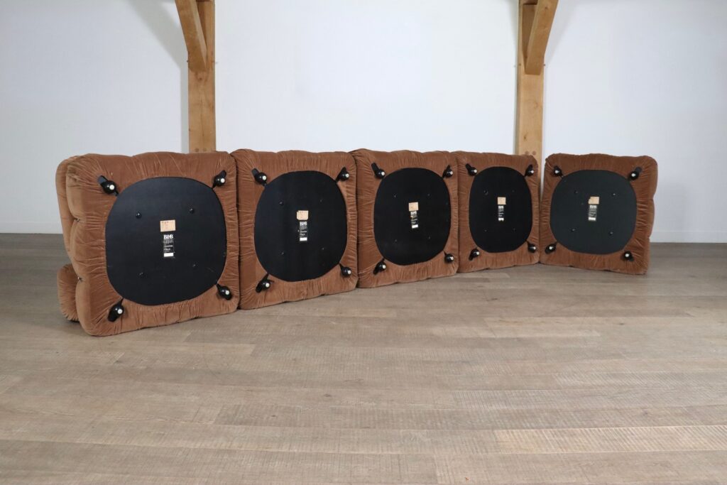 This beautiful set consists of five large elements, of which four with armrests, all in completely original and very nice condition! This iconic design is known for its outstanding comfort and great looks. The combination of the soft neutral light brown velvet with this chunky design provides an outstanding comfortable seating experience. The sofa is completely modular, providing endless flexible solutions for any project or living room. Both the armrests and backrests can be placed in any setting preferred, to create the dream setting to match your space. The Camaleonda design became famous almost immediately after it was featured in the exhibition ‘Italy and The New Domestic Landscape’ in the MOMA Museum in 1972. Now is your chance to elevate your space with this outstanding set!