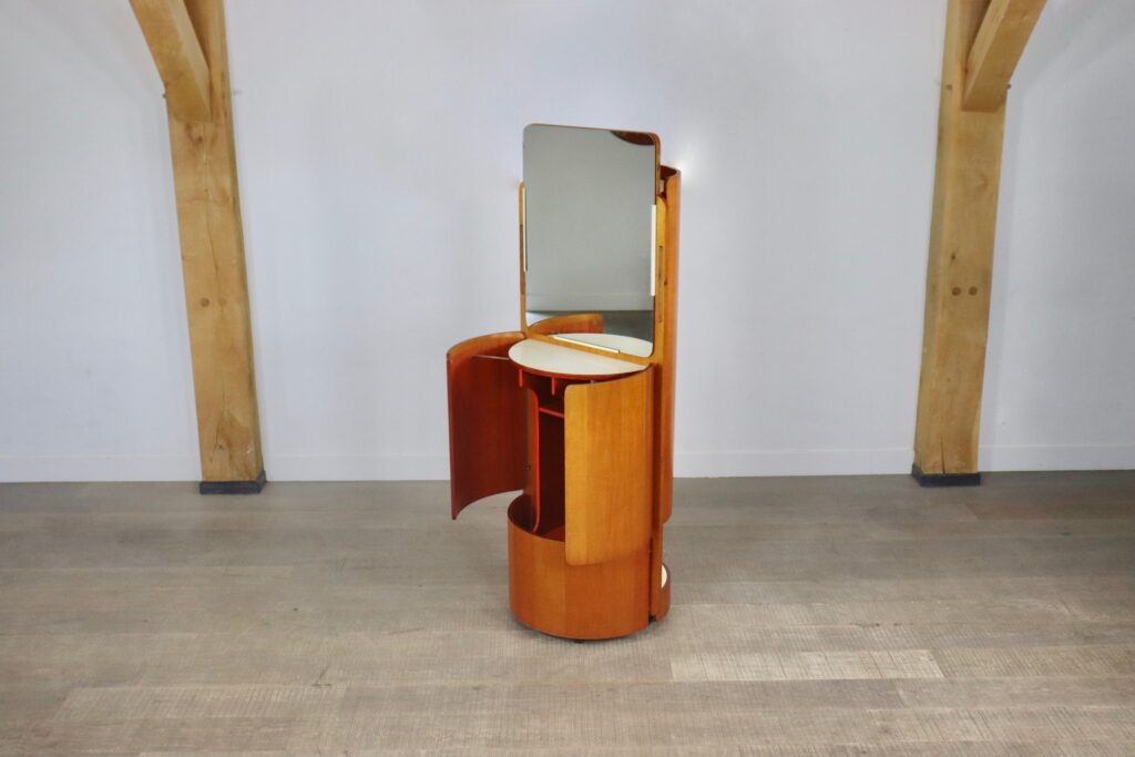 Fantastic and rare Carlo De Carli Vanity Wardrobe in walnut with a swivel base for Fiarm, 1960s. This stunning piece folds open to a coat hanger with the coat hangers, which are the iconic design of renowned designer Carlo de Carli, and has a bottom plateau to store shoes. When you spin the wardrobe it reveals a large mirror, vanity table and storage for both smal items and items such as your umbrella. The wardrobe is made of a nice walnut veneer, which has an incredible grain. The brass joints were designed to be visually pleasing, with great attention to detail. This is a truly warm and unique welcome!