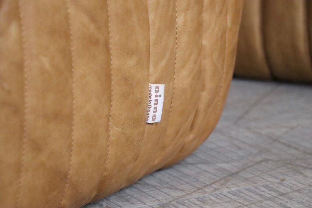 Beautiful three seater sofa with ottoman in stunning tan leather, by Annie Hieronimus for Cinna, a division of Ligne Roset, France 1970s. This incredibly comfortable, yet lightweight design will instantly bring character to any room! Reupholstered in high quality aniline leather in a beautiful tan colour. This nice combination brings out the beautiful lines and character of this design, and will bring warmth and a cozy feeling into any space! Take a seat in style in this iconic sofa!