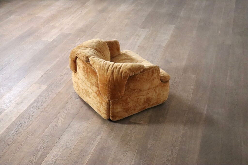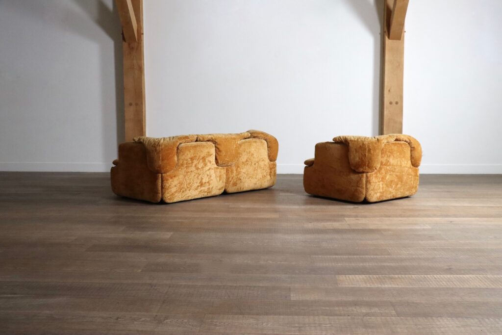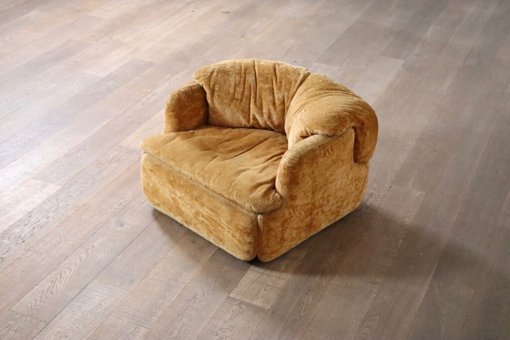 Stunning Confidential two seater sofa and lounge chair, in original mustard velvet, crafted by renowned Italian architect and furniture designer Alberto Rosselli in 1972 for Saporiti Italia.