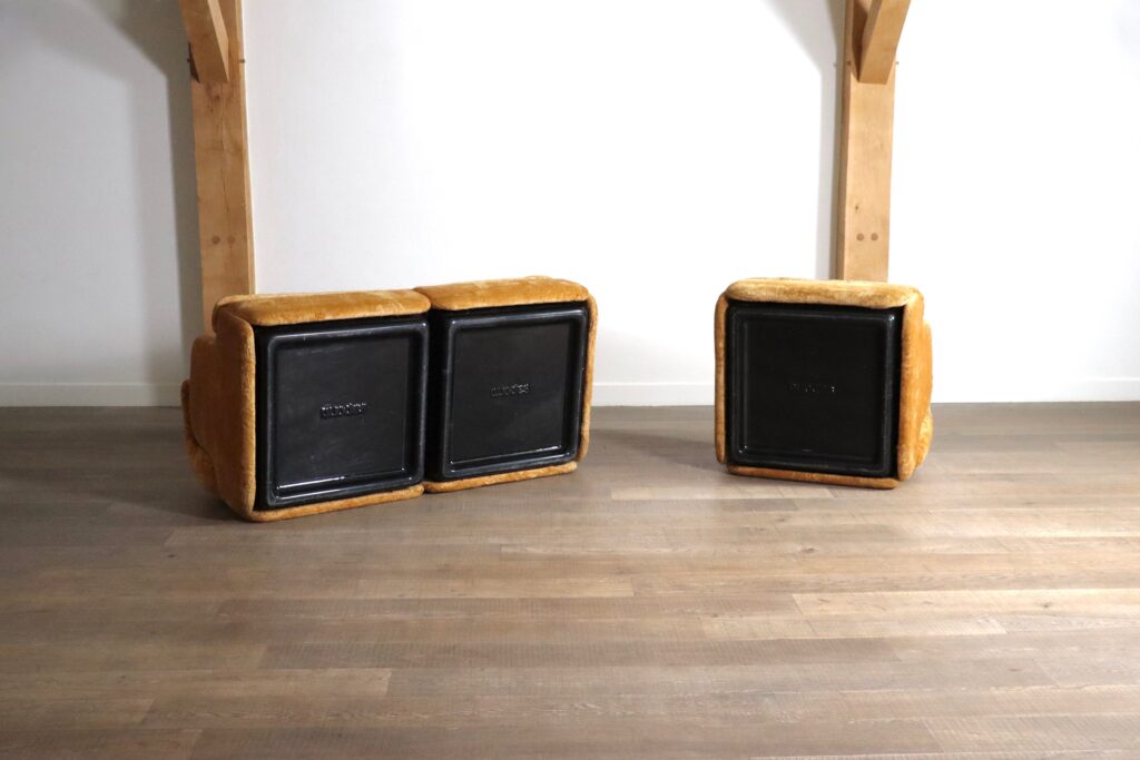 This particular pair has its original thick velvet upholstery, in a nice mustard color, which compliments the striking, luxurious design of the sofa. The upholstery is in excellent vintage condition, which is a rare find. Rosselli’s innovative design showcases an interesting connection between the backrest and cushion, creating a unique, playful aesthetic that defines this design. As one of the first modular sofas made for home use, it offers versatility with puzzle-like cushions that fit together Nicely. This sofa will bring a calm, yet luxurious feeling into your home, and adds a high comfort to any space!