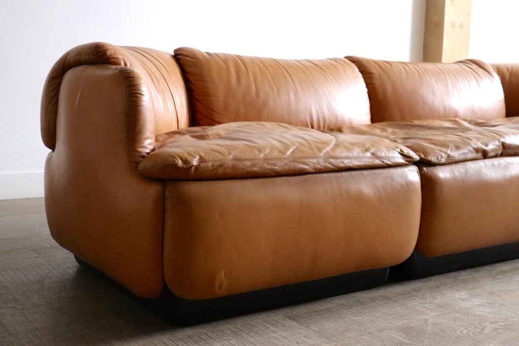 This particular three seater sofa set has its original leather upholstery, in a stunning cognac color, which compliments the striking, luxurious design of the sofa. Rosselli’s innovative design showcases an interesting connection between the backrest and cushion, creating a unique, playful aesthetic that defines this modular sofa. As one of the first modular sofas made for home use, it offers versatility with puzzle-like cushions that fit together Nicely. This sofa will bring a calm, yet luxurious feeling into your home, and adds a high comfort to any space!