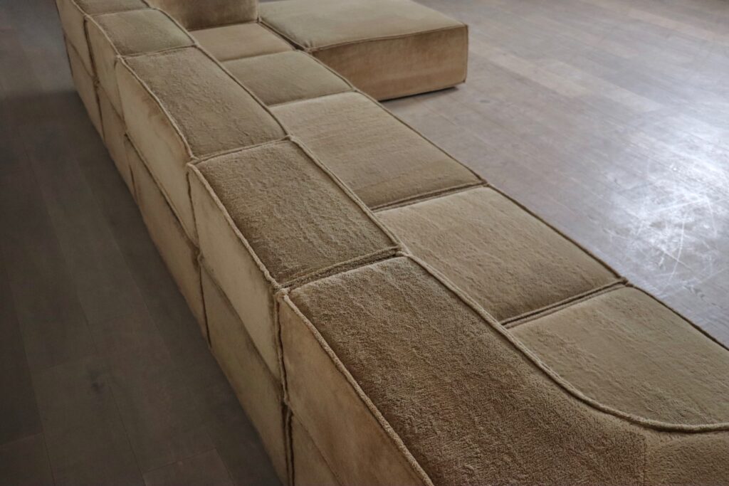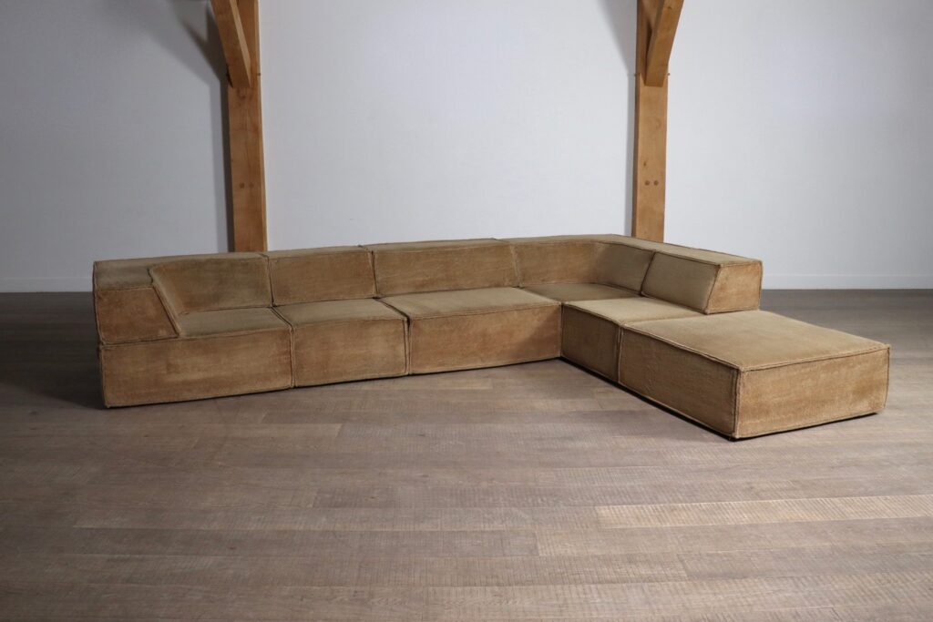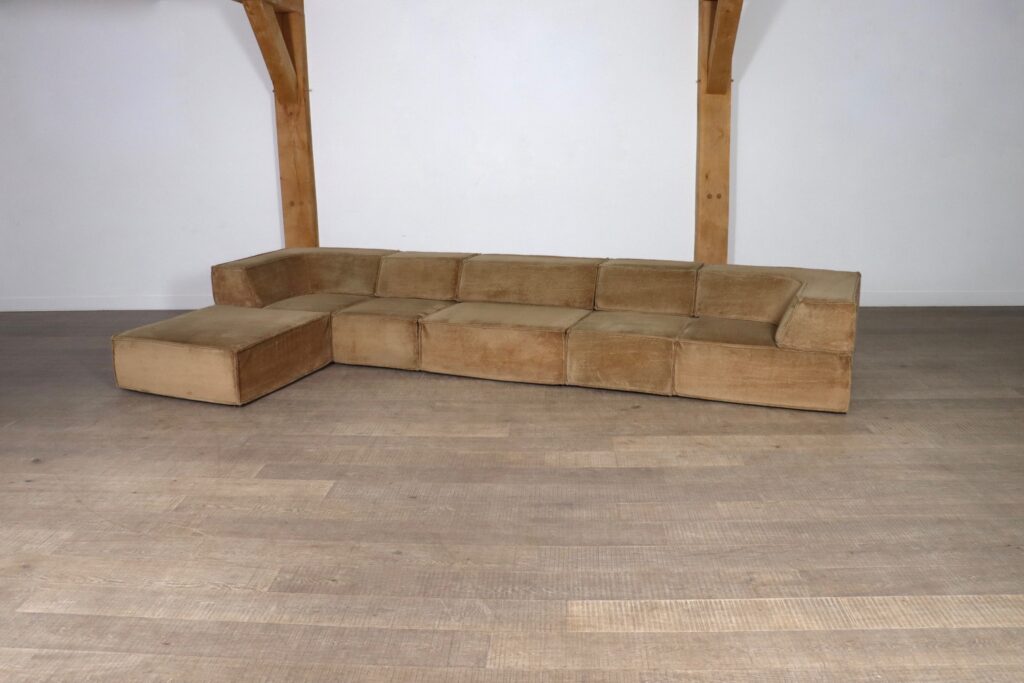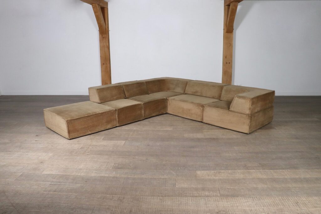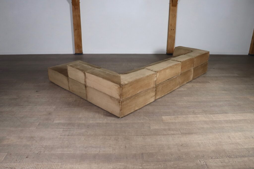 This particular sofa consists of four large elements of which two corners and one ottoman and two small elements. This beautiful sofa blends seamlessly into any environment, especially with this calm rich color. This particular color is very hard to find in good condition, and is highly sought after.