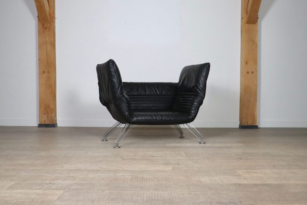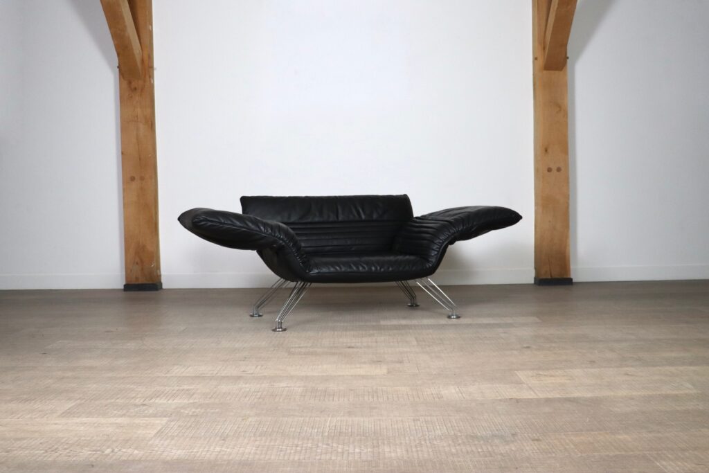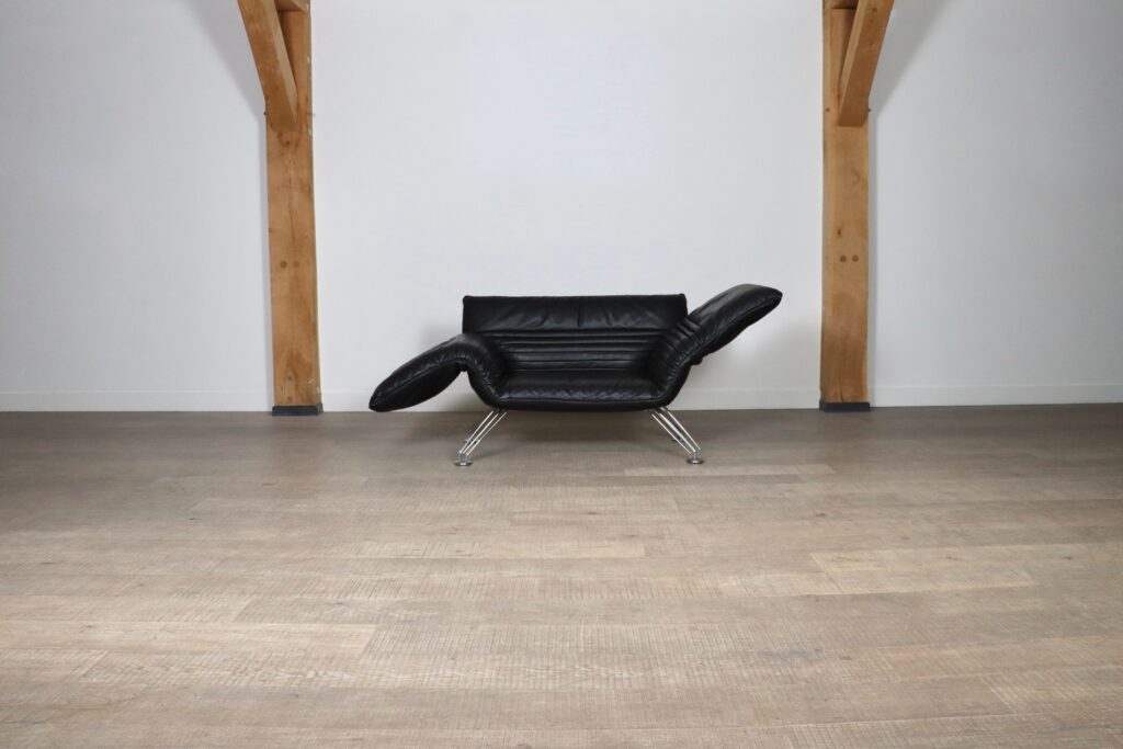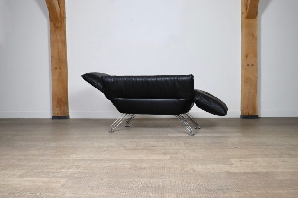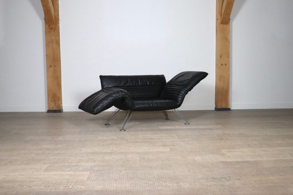 This beautiful and multifunctional De Sede DS 142 designed by Winfried Totzek in 1988 is everything you can dream of. With individually adjustable armrests and backrest, this makes it also possible to use this sofa as a chaise lounge. Hand built and upholstered in stunning soft black aniline leather, this piece is in very good condition and extremely comfortable.