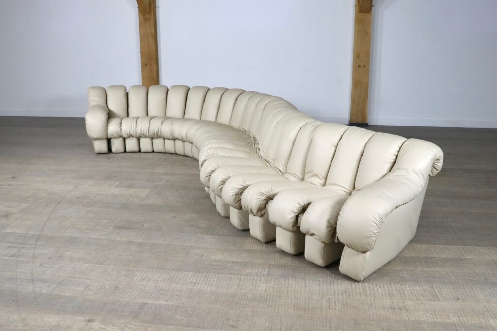 Incredible De Sede DS 600 “Non-Stop” sectional sofa by Heinz Ulrich, Ueli Berger and Elenora Peduzzi-Riva. This stunning cream leather in excellent condition is used on both the seating and bases of the sofa. The sofa consist of 22 pieces, all of which hook and zip together by De Sede’s unique system. Create your own sculptural shapes with ease in any form you wish with this ‘snake’ like sofa!
