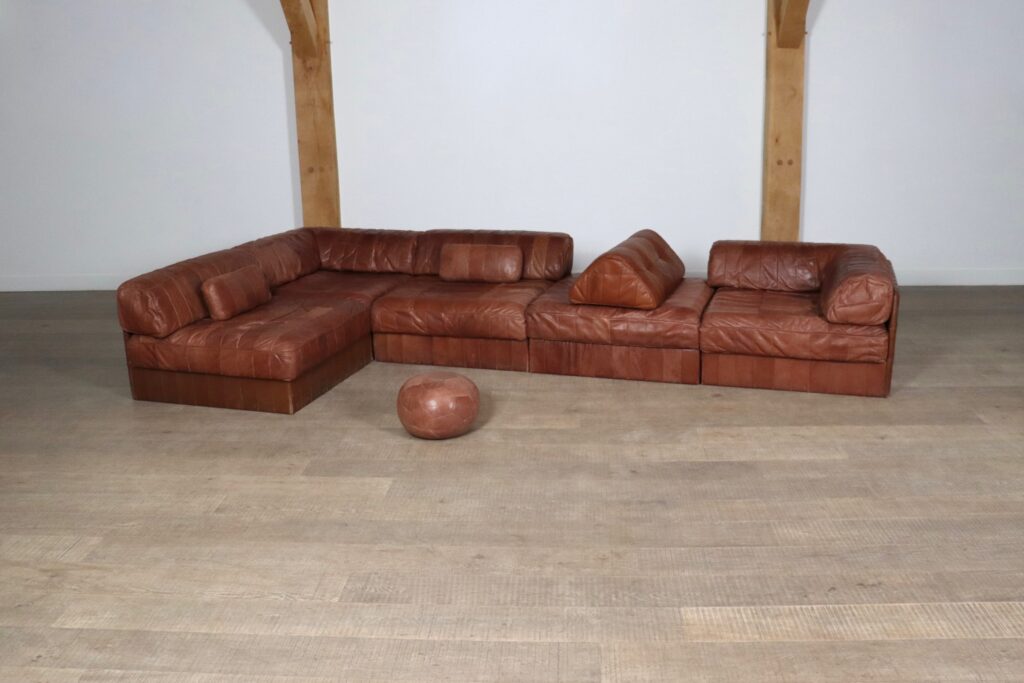 The sofa consists of five elements, of which two corners, each with a cognac leather patchwork base, seating cushion and back cushion made from the same soft leather with a nice light patina. De Sede is known for using only the highest quality leather, which is why their designs are still popular today. The sofa has four wooden back supports covered in matching patchwork leather to allow the sofa to be placed freely in the room. One of the back rest cushions is a triangle shape, to create an extra seat, ottoman, border or a headrest for a lounge spot. This set also comes with a matching De Sede ball cushion and two matching smaller cushions for extra comfort. Create your dream seating area with this timeless design.