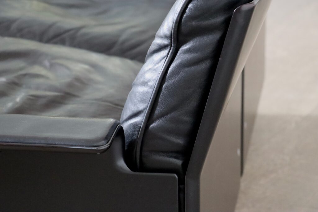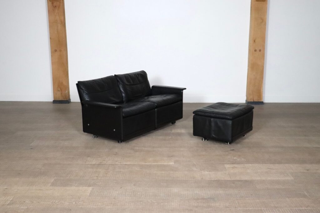 Nice two seater sofa with ottoman in black leather by Dieter Rams for Vitsoe. The black outer shell is made from a hot-pressed sheet-moulding compound, which is similar to, but stronger than fiberglass. This sofa is made with the highest-quality black leather, to last for generations. A modern classic which will be a nice addition to any space.