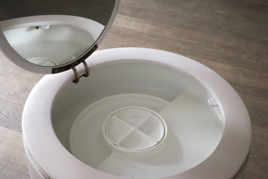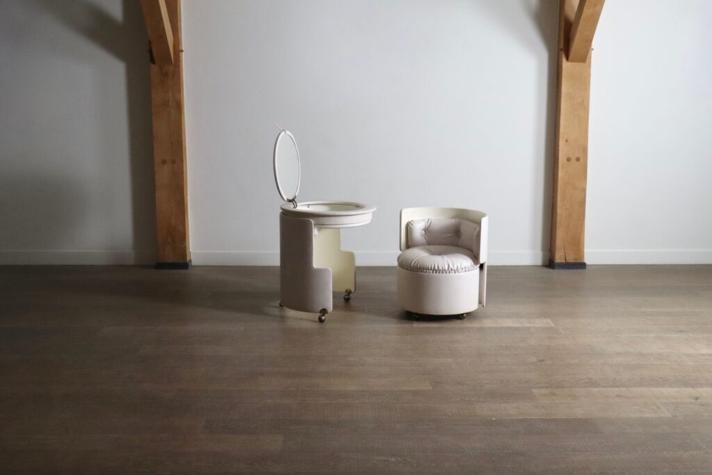 This beautifully designed and practical vanity set seamlessly combines style and functionality. The chair is cleverly crafted to fit neatly into the table, saving valuable space when not in use. The table’s top opens to reveal a round mirror, alongside molded plastic trays with dividers to organize makeup and accessories with ease.