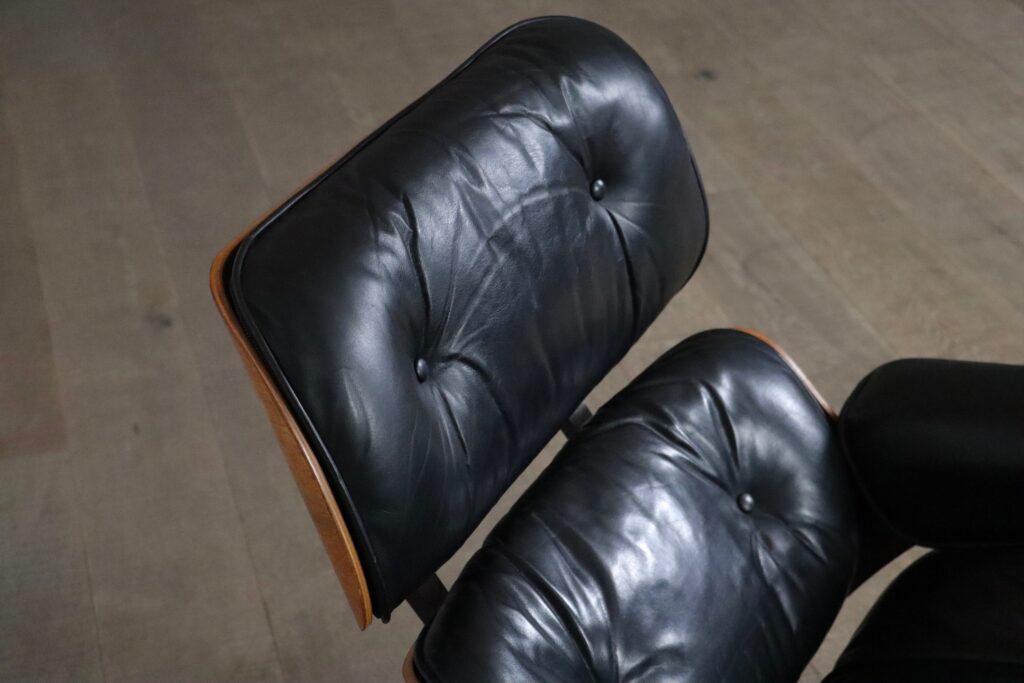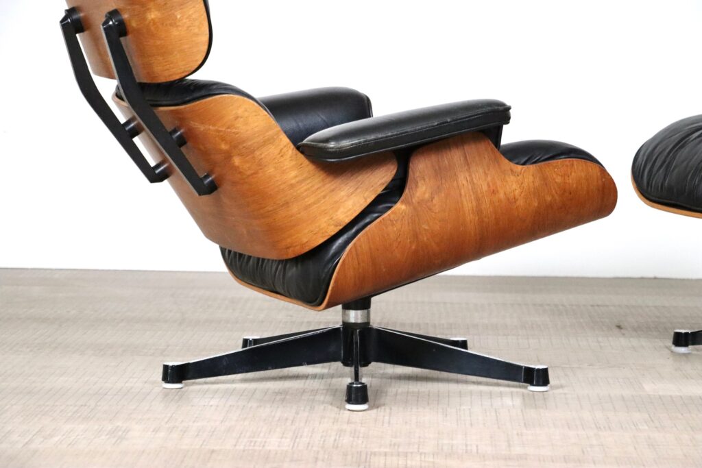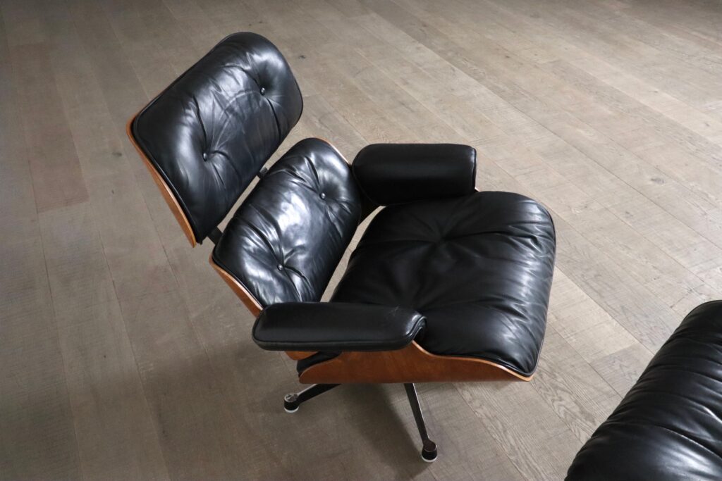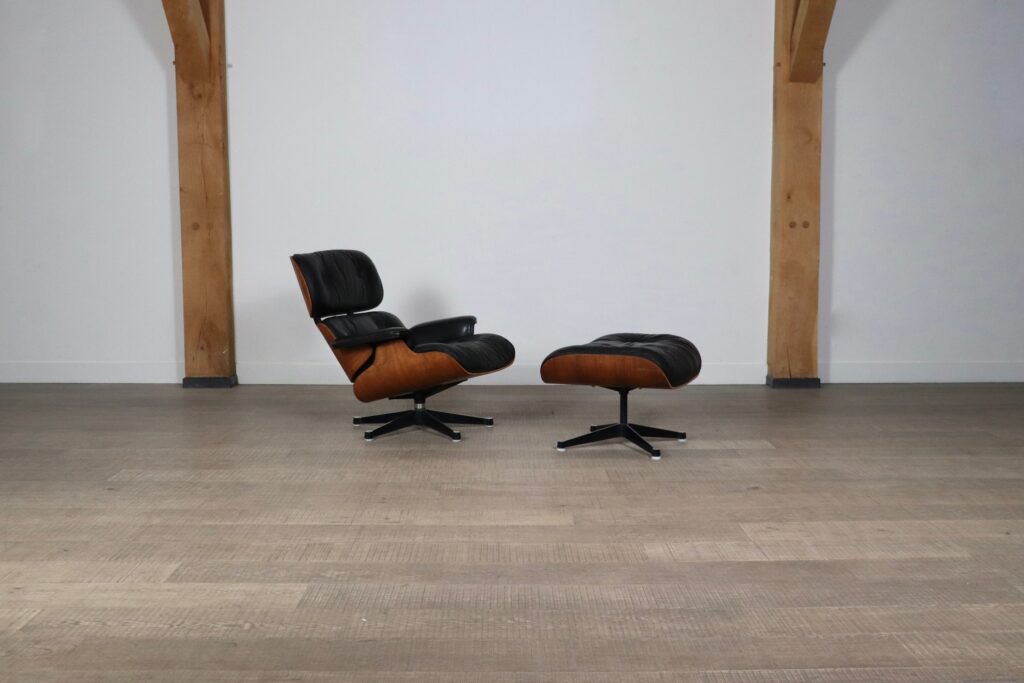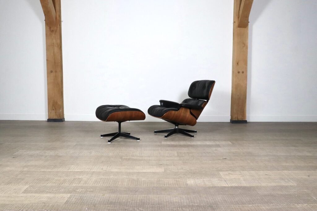 Nice Eames lounge chair with ottoman by Charles and Ray Eames for Herman Miller, 1970s. The frame is made of original Rio rosewood veneer, which has a beautiful calm grain. This timeless design has become a design icon ever since it first came out. The usage of high quality materials and the beautiful combination of metal, wooden frames and nice soft leather makes these chairs very versatile and will be a nice addition to any interior. Besides its good looks, this chair is also highly comfortable, due to the thick padded cushions and ergonomic shape. The original black leather is still in good condition, with a nice overall patina. Together with the ottoman, it becomes the ultimate lounge! A beautiful set which will elevate any space!