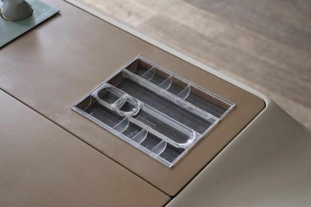 This particular model is the most impressive of the Ernest Igl desk designs, as the name gives away: ‘Directors desk”. The model is made in one piece with the iconic shaped drawers on each side, a hidden storage underneath the writing pad area, and the original phone and pen storage department. This phone and pen storage area can be switched out to a plain panel to create more working space or a more minimalistic look when desired (see pictures). The attention to details and comfort in this desk is immaculate, given even the foot of the desk is not just left open, but comes with an angled foot rest, with a built in carpet to sit comfortably. This carpet is renewed to ensure a fresh and comfortable use for years to come. The desk is designed to be placed freestanding the room, as it is beautiful from each side. Create an impressive work place with this eye catching desk.