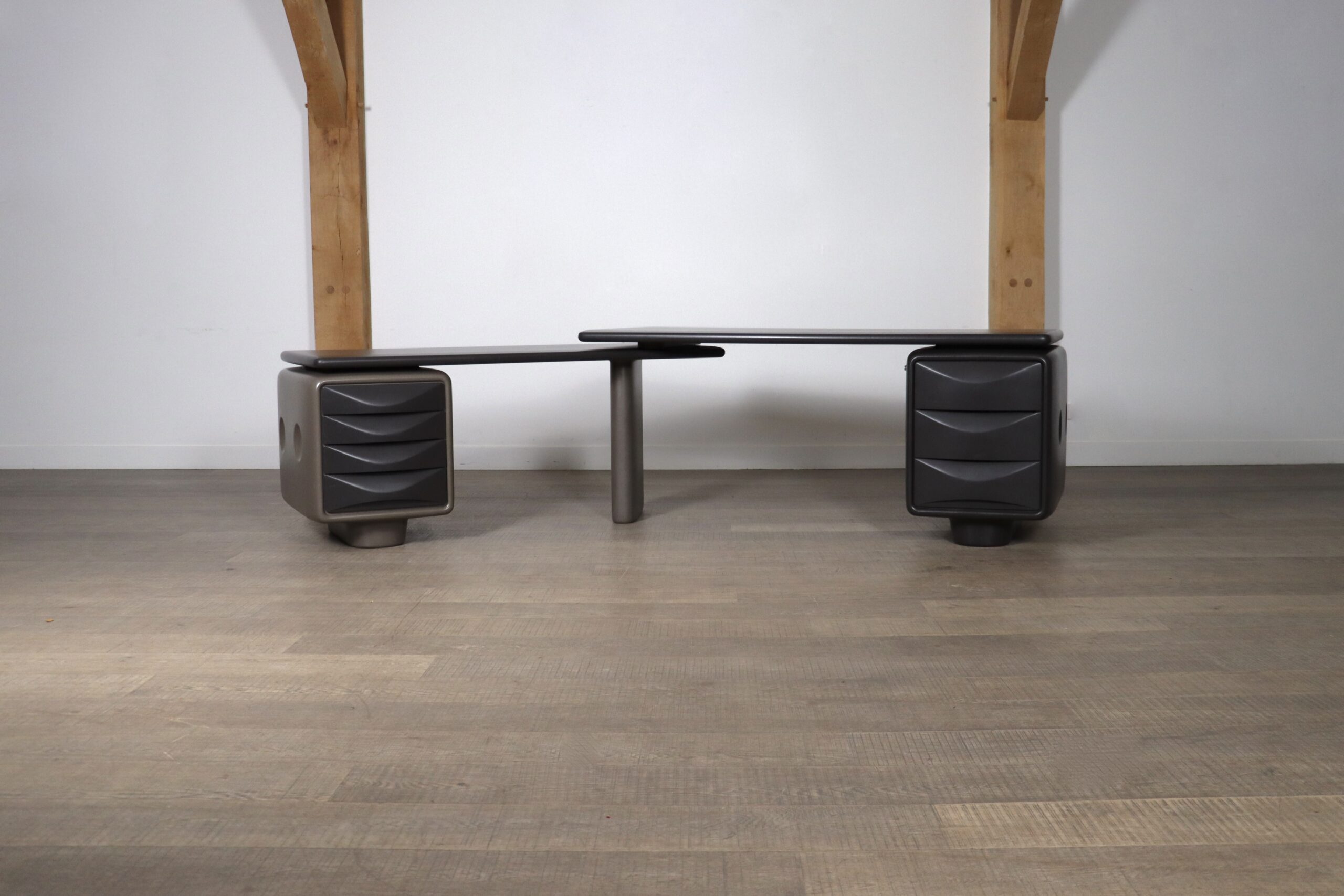 A futuristic design, with a clever movable construction, allowing to position it as a long, straight desk, or as a corner desk makes the design both functional as interesting. Igl’s initial desk design was one of the first to be made entirely out of plastic. The revolutionary concept and grand vision behind this corner desk are evident in its rounded corners, soft edges, and stunning shapes.