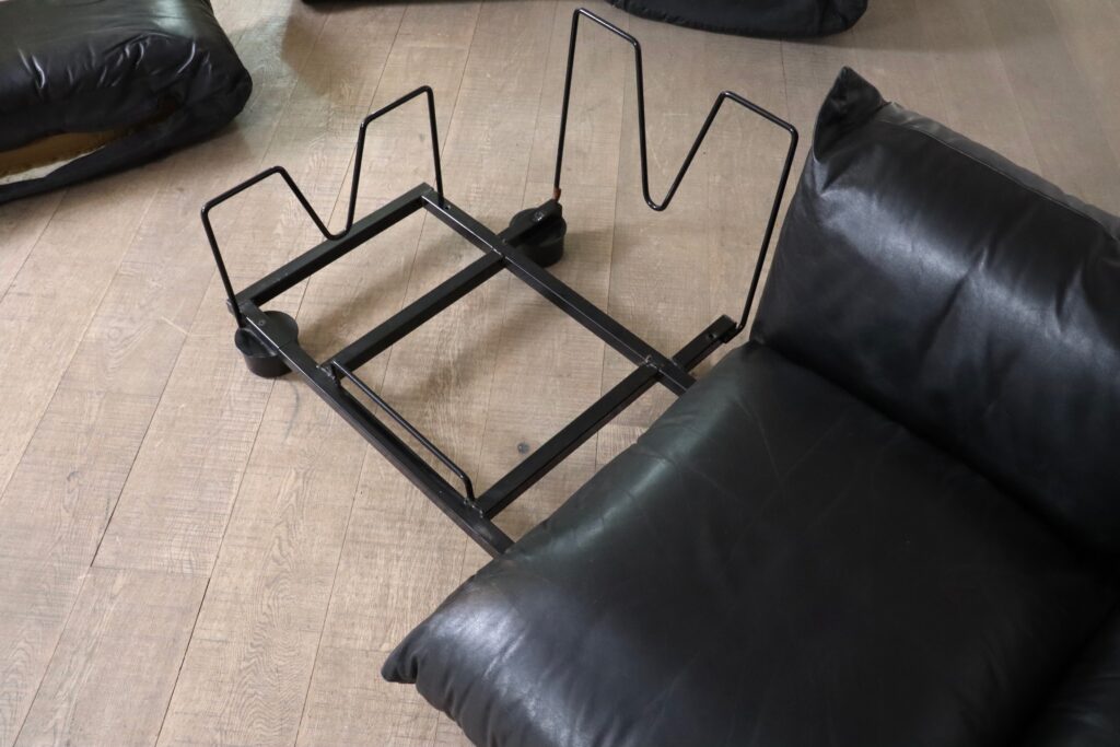 This particular version, is an early edition and features the original black leather upholstery from the 1970s. The exceptional comfort, which is where the design is known for, is because its individually padded and upholstered cushions. The combination of soft polyurethane padding, metal tubular framing, and wooden base ensures both durability and a plush seating experience. The cushions—back, seat, and armrests—are uniquely designed to slip into the supporting metal frame, providing both structure and firmness to the sofa.