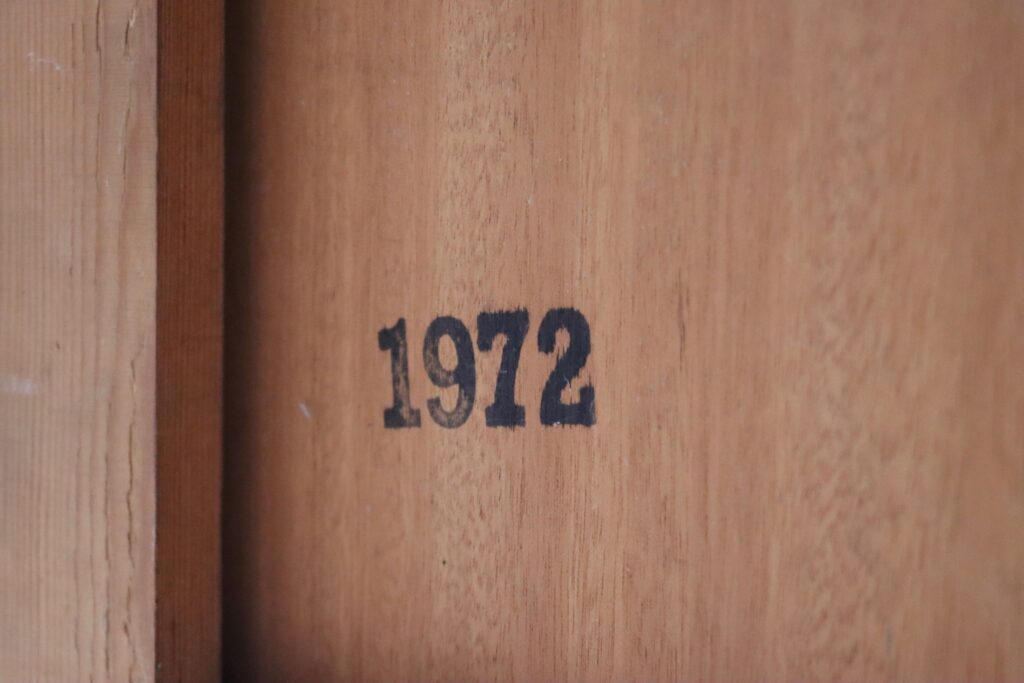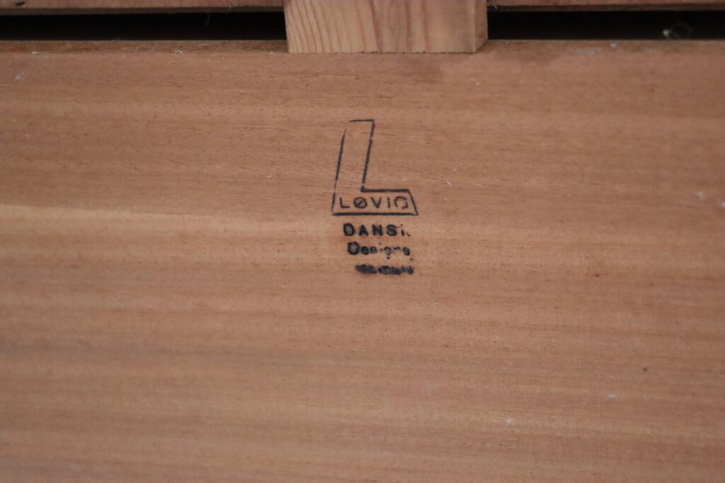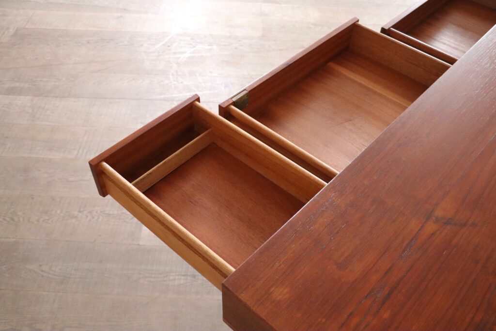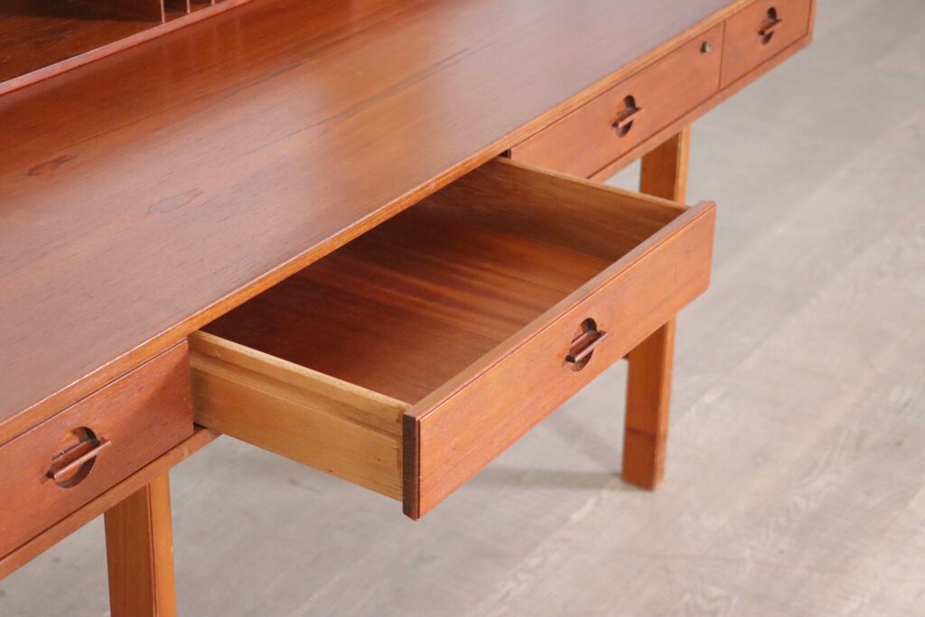 Nice Flip-Top desk designed by Peter Løvig Nielsen and often attributed to Jens Quistgaard, this ingenious desk has a shelf that flips, creating a flat work surface. Ideal as a shared desk for a studio or office. Full surface with measures 96cm. Beautiful details throughout, from the original brass hinges to the attractive carved circular drawer pulls. Underside is stamped “Lovig Dansk Designs Denmark & 1972.”