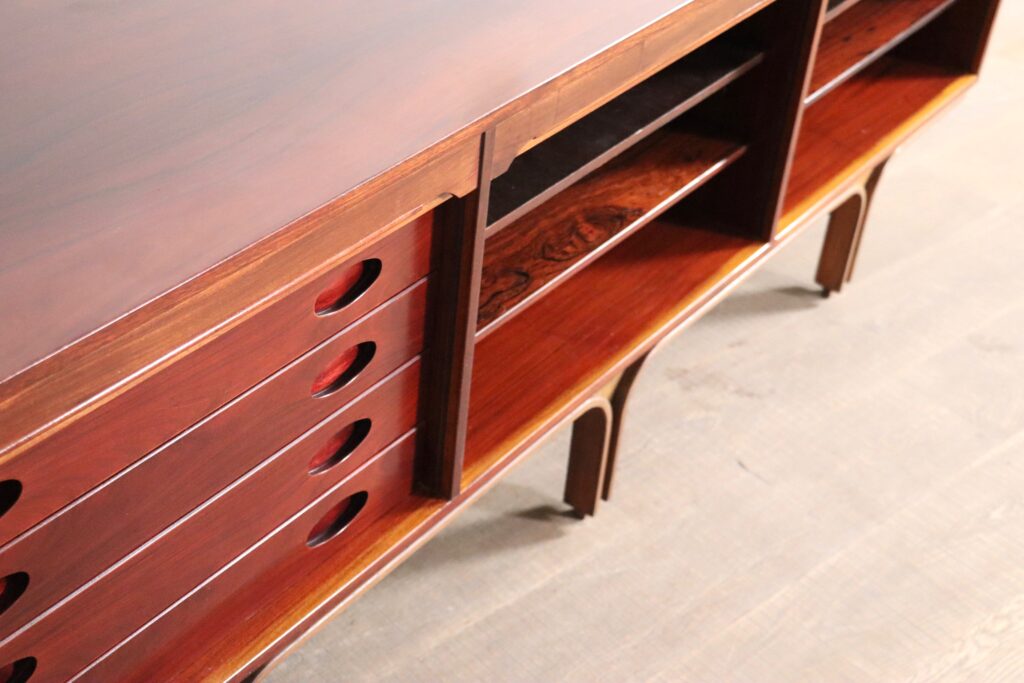 The three vertical tambour doors feature an incredible wood grain pattern of exotic rosewood. Once rolled up, they reveal four drawers, and six shelve spaces, which allow for plenty of storage room. These spaces can be concealed to instantly bring a tidy look when just closing the door, or chosen to display the items inside. This both practical and beautiful design feature makes this a must have. The frame is made of bentwood and has the shape of roman architectural bows. These series are well known by Frattini and one of his most succesful designs in the 1950s.