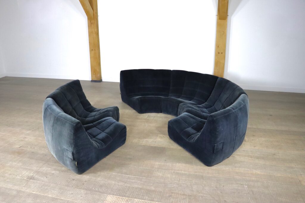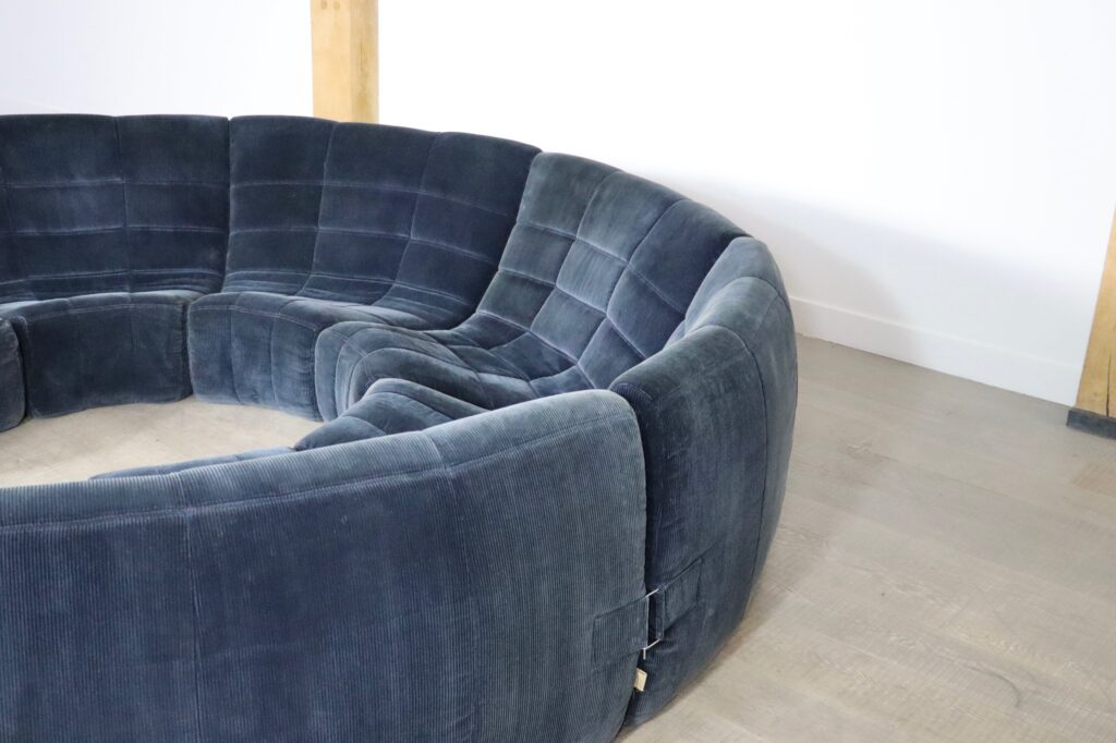 Rare ‘Gilda’ sofa by Michel Ducaroy made in 1972. This early edition is manufactured by ‘Roset’, which was the company name of Ligne Roset prior to 1973. The beautiful navy corduroy upholstery fits this groovy design really well. This sofa consists of two round elements and four straight elements which create endless setting possibilities. The elements are connected with metal buckles in the back. This breathtaking design is besides is funky looks also incredibly comfortable! Once you sit down you never want to get up!