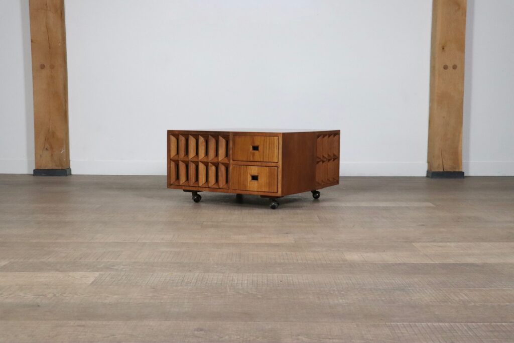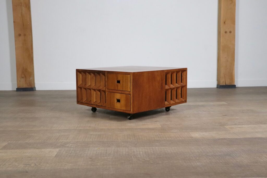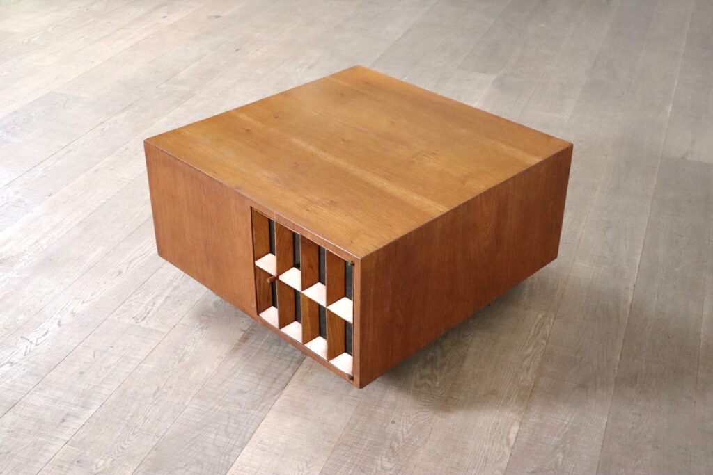 Exceptional coffee table by the Italian sculptor and designer Giuseppe Rivadossi, featuring a high level of craftsmanship in woodwork. This unique coffee table features Rivadossi’s signature glass window design. This iconic design is highly sought after, and is rarely seen in the shape of a coffee table. The beautiful Slavonian oak shows a beautiful wood grain. The inverted design of the windows bring an interesting dimensional look in the coffee table. The two doors on the opposite side of the drawers connect internally, creating a large storage space. When sunlight streams through one side of the windows, it bathes the interior of the coffee table in a breathtaking scene, visible through the opposing windows.