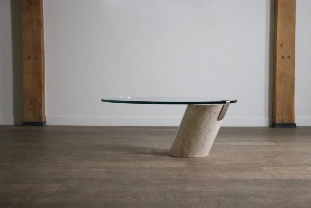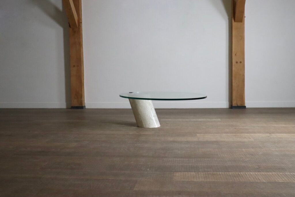 A striking design which has a floating and cantilevered effect due to the thick glass being clamped at one single edge, which offers a great stability. The beige marble foot also has an interesting design due to it being made at an angle. But due to the innovative design this coffee table is as solid as can be, due to usage of thick glass, a solid marble base and a metal clamp, which with their weight hold up very steady.