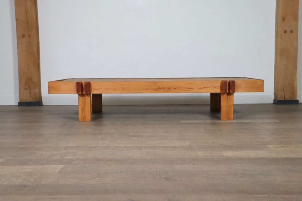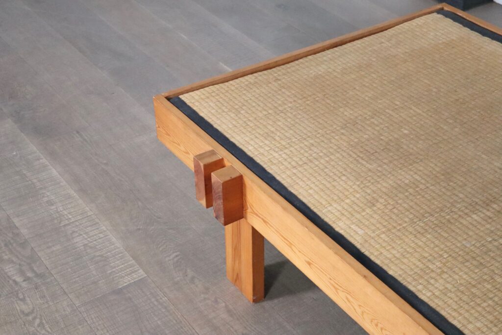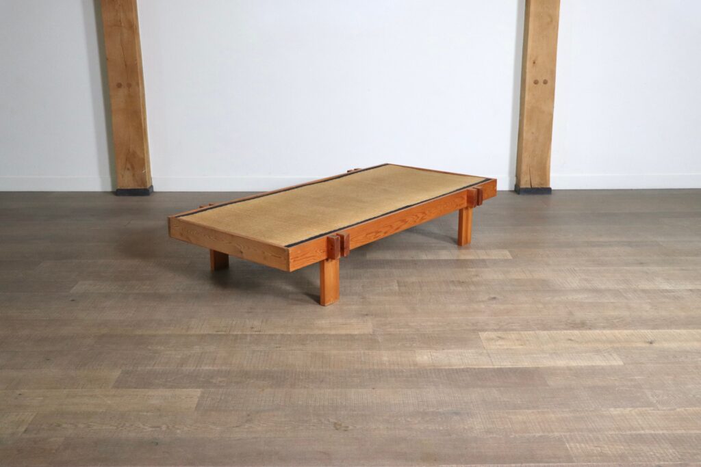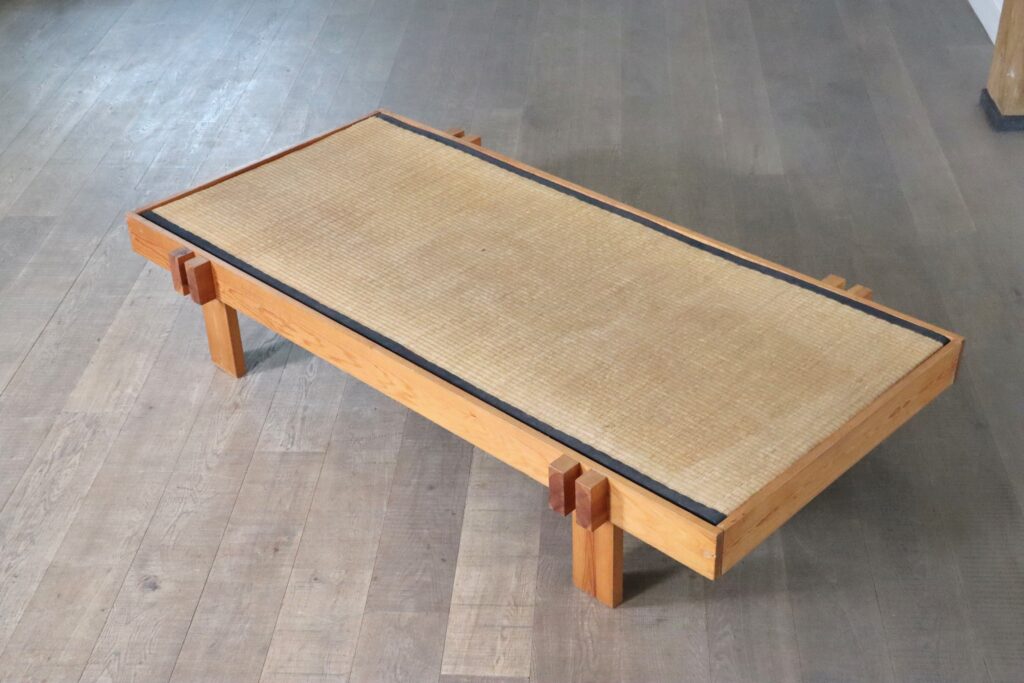 Beautiful Japanese coffee table made of wood and seagrass, Japan 1960s. A nice example of a minimalistic coffee table which brings harmony in a busy life. A nice large table top made of a thick seagrass inlay resting in the wooden frame. With the arrival and uprising popularity of the Japandi interior trend, this coffee table fits this aesthetic perfectly, while also ensuring a unique find. This nice table can also be used to experience traditional Japanese low dining and create unforgettable nights.