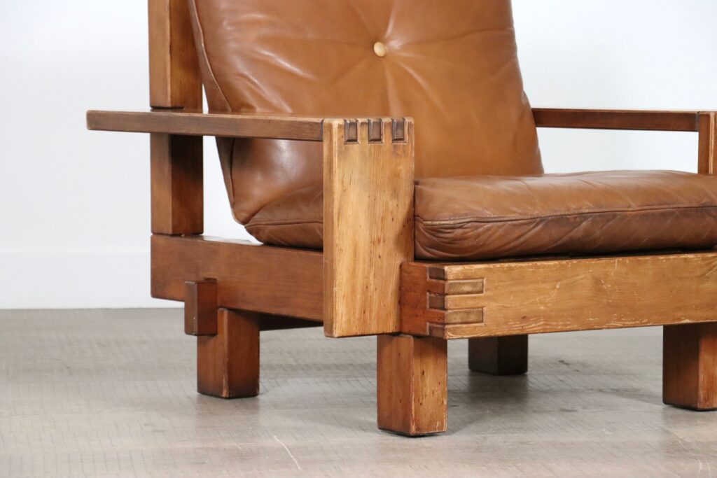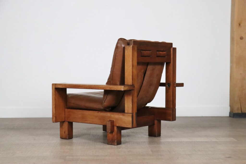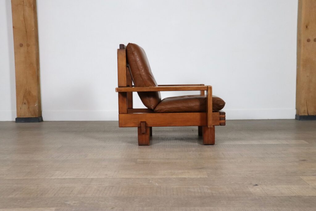 Midcentury modern Brutalist lounge chair in oak and leather, Italy 1970s