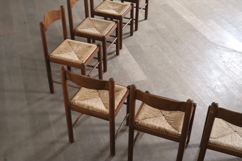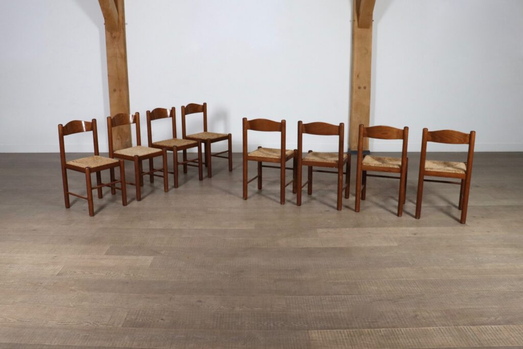 Midcentury modern dining chairs in oak and rush, France 1960s
