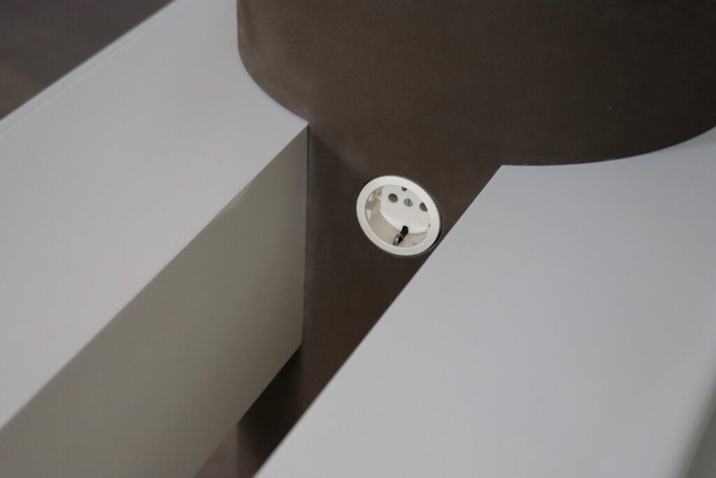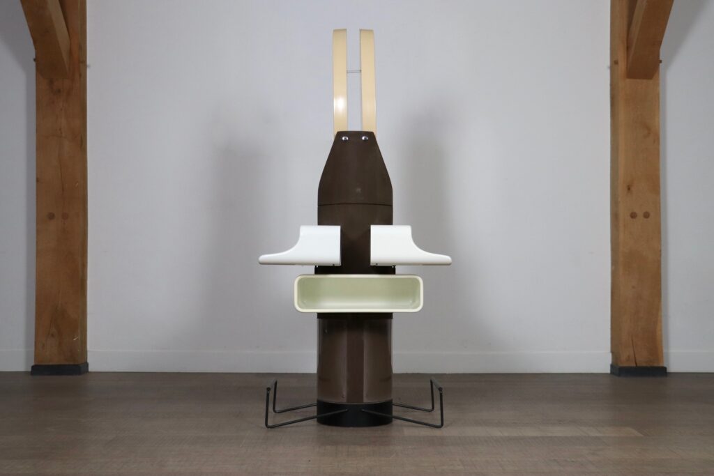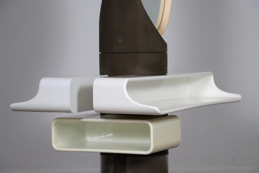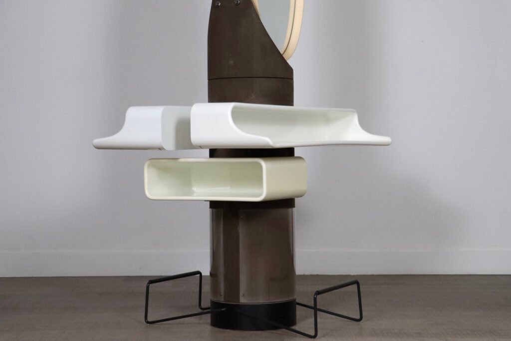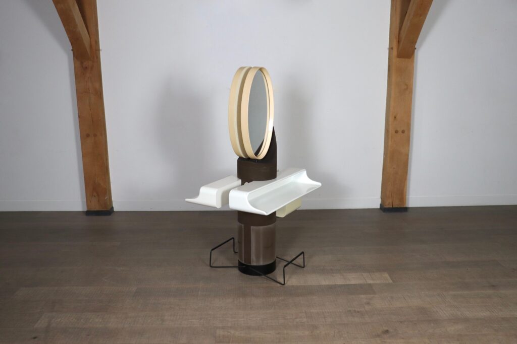 A both wonderful, and convenient design, where you can use this dressing table on both sides to get ready together. Two plastic trays are positioned underneath the mirrors to lay out your products, and one other to store additional items. The usage of plastic and rounded shapes was very innovative in the 1960s, and an iconic space age design. The most unique feature of this vanity table is the built in socket in the middle. Ideal for when you want to use a hairdryer or styling device while getting ready.
