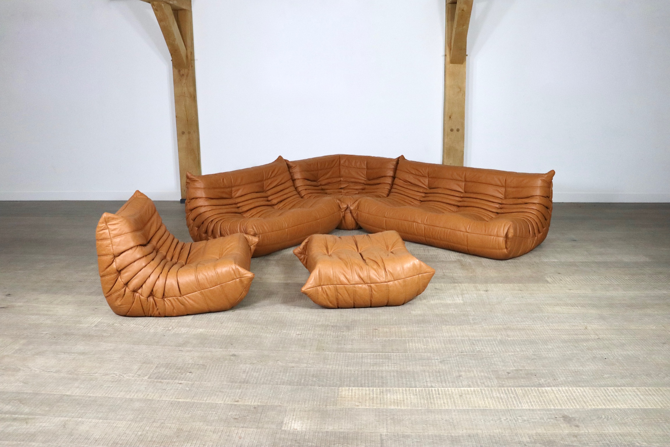 Beautiful cognac leather Togo seating group by Michel Ducaroy for Ligne Roset, 1980s. The entire seating group has the original Ligne Roset logo. The set consists of a 3-seaters, two seater, corner, a lounge chair and an ottoman. The beautiful soft leather combines perfectly with this iconic design, and brings any space warmth and comfort.