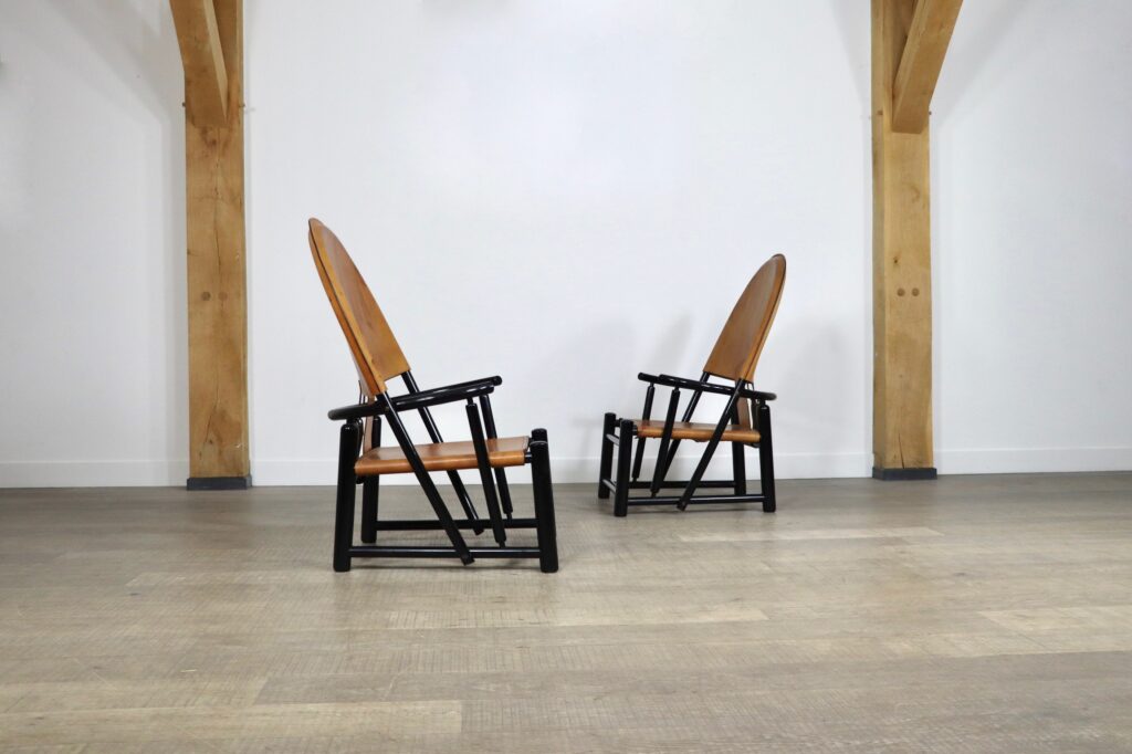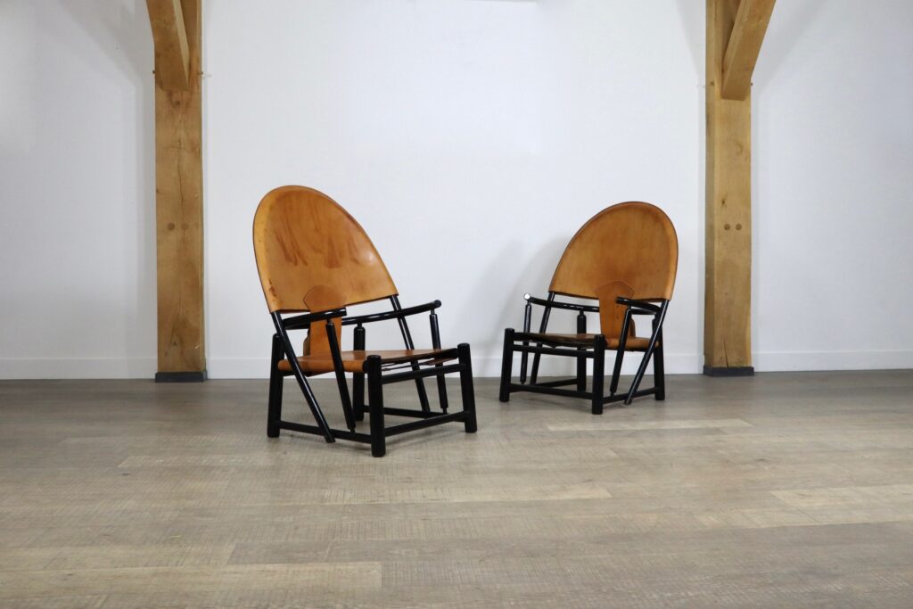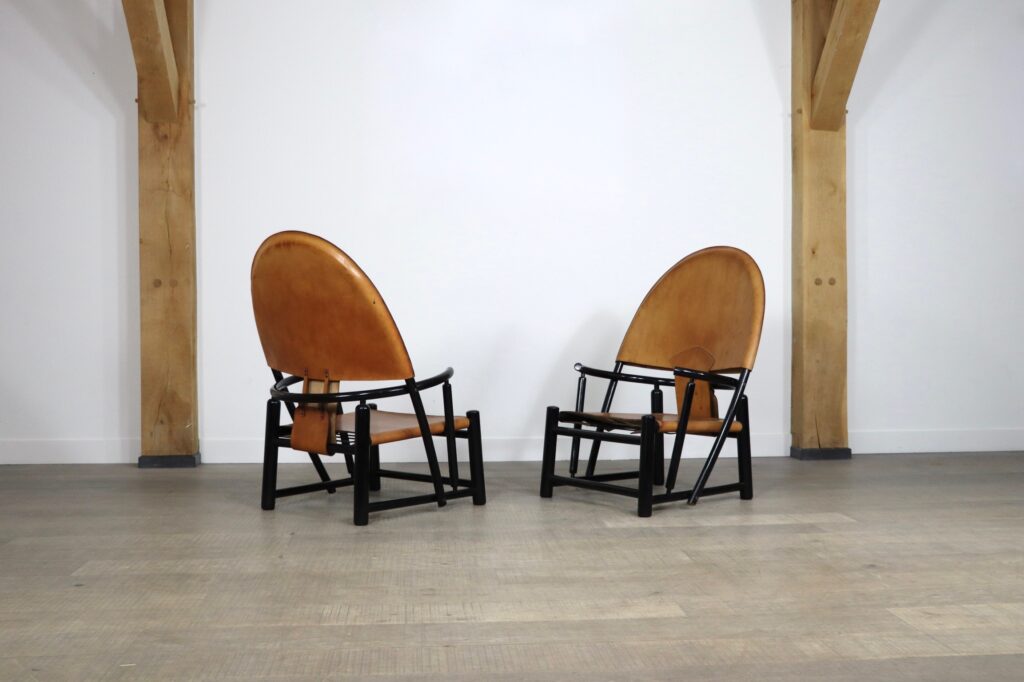 Pair of G23 ‘Hoop’ chairs by Piero Palange & Werther Toffoloni in beautifully patinated cognac leather and black lacquered wooden frame. This beautiful chairs were produced by Germa in 1972 and became known as the ‘Hoop’ chair. This high quality chairs, with steam bent beech frame, have beautiful detailed design: all the way from the front legs to the rear, and upholstery which was pulled over the frame and laced up on the bottom. Any space will be elevated by its stunning and organic design.