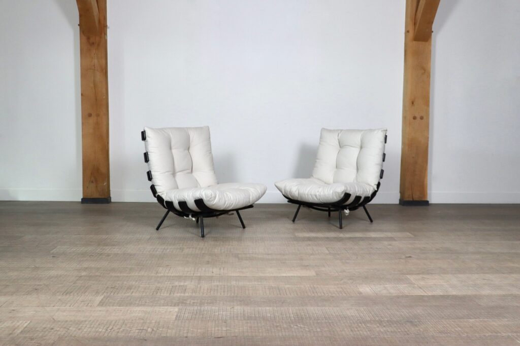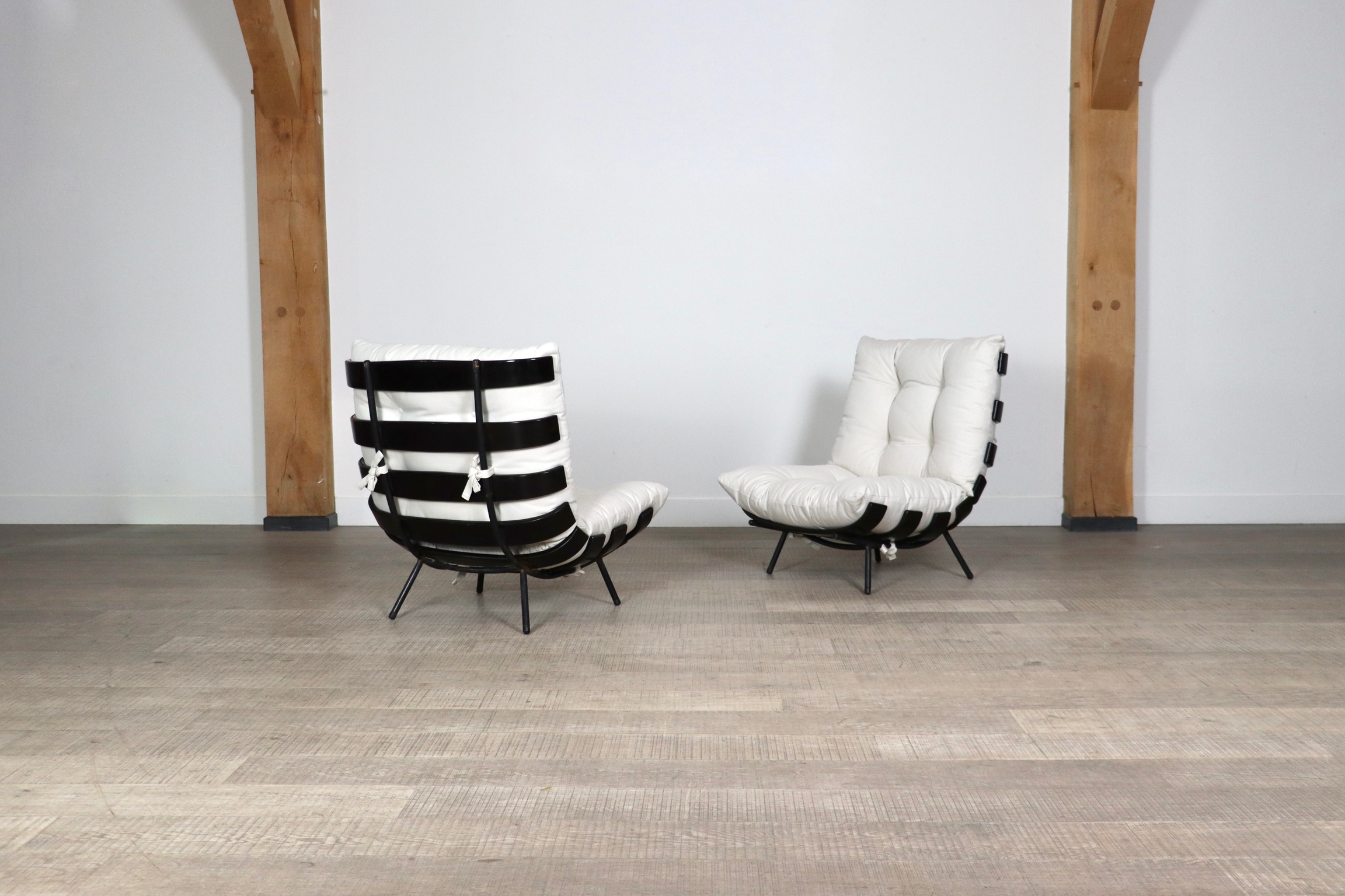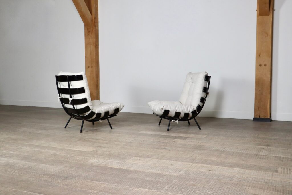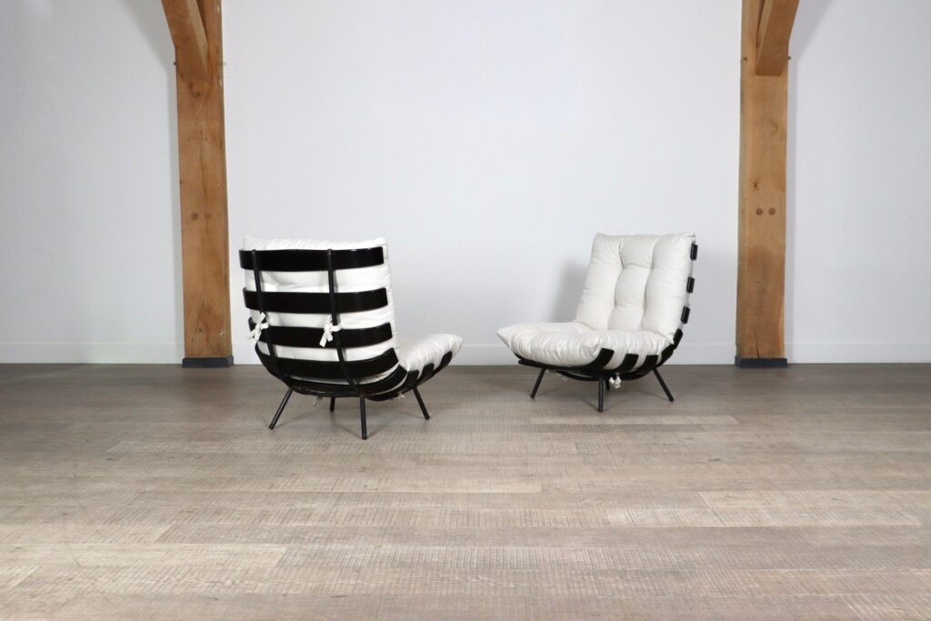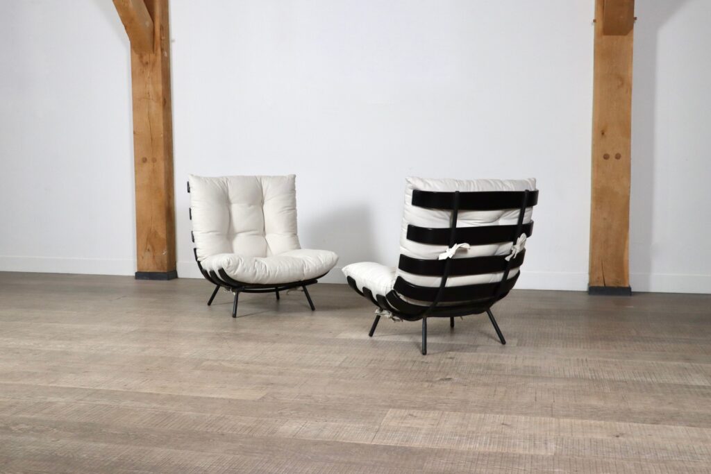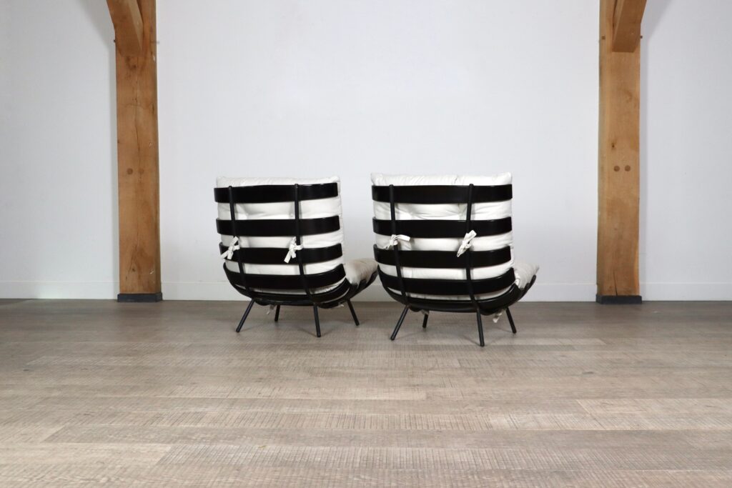 The beautiful ‘Costela’ lounge chairs by Carlo Hauner and Martin Eisler are one of the icons of Brazilian Mid-Century Modern Design. The name ‘Costela’ which translates as rib, is apparent in the design with it’s eight dark stained wooden slats that resemble a rib structure. The slats are rhythmically positioned and curve upwards on the sides. A curved black coated tubular steel frame with short legs and wooden shoes create the necessary support. The nice off-white linen cushions are attached to the backrest and seat by tied strings, gently embraced by the curve on the wood slats’ edge. Create a warm and luxurious ambience with these true design icons!