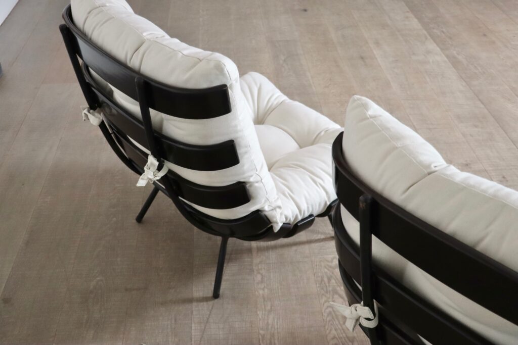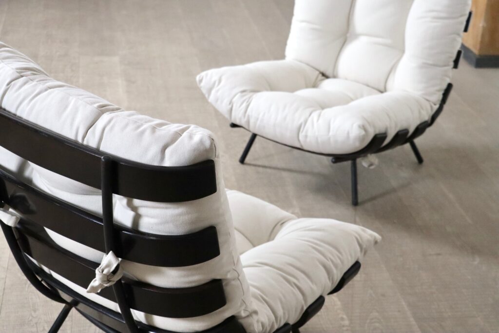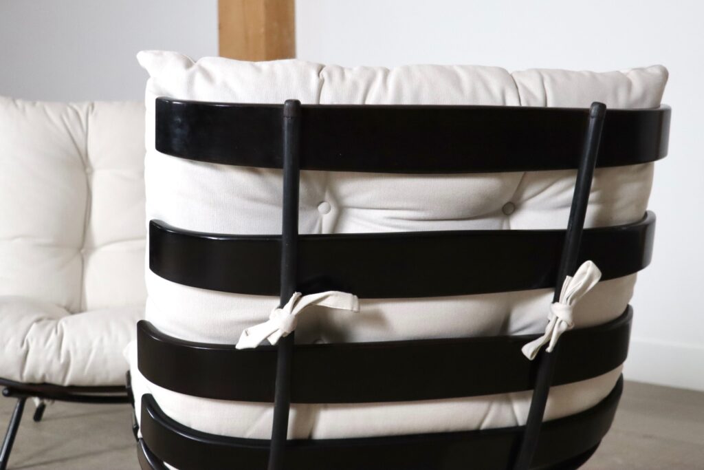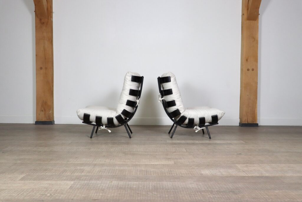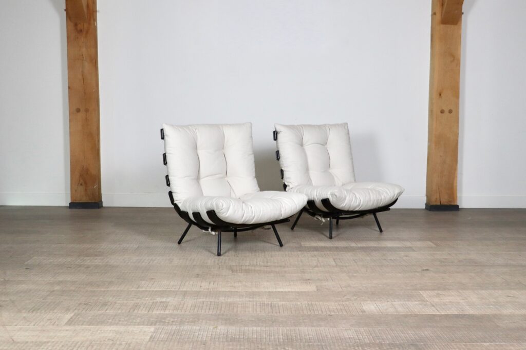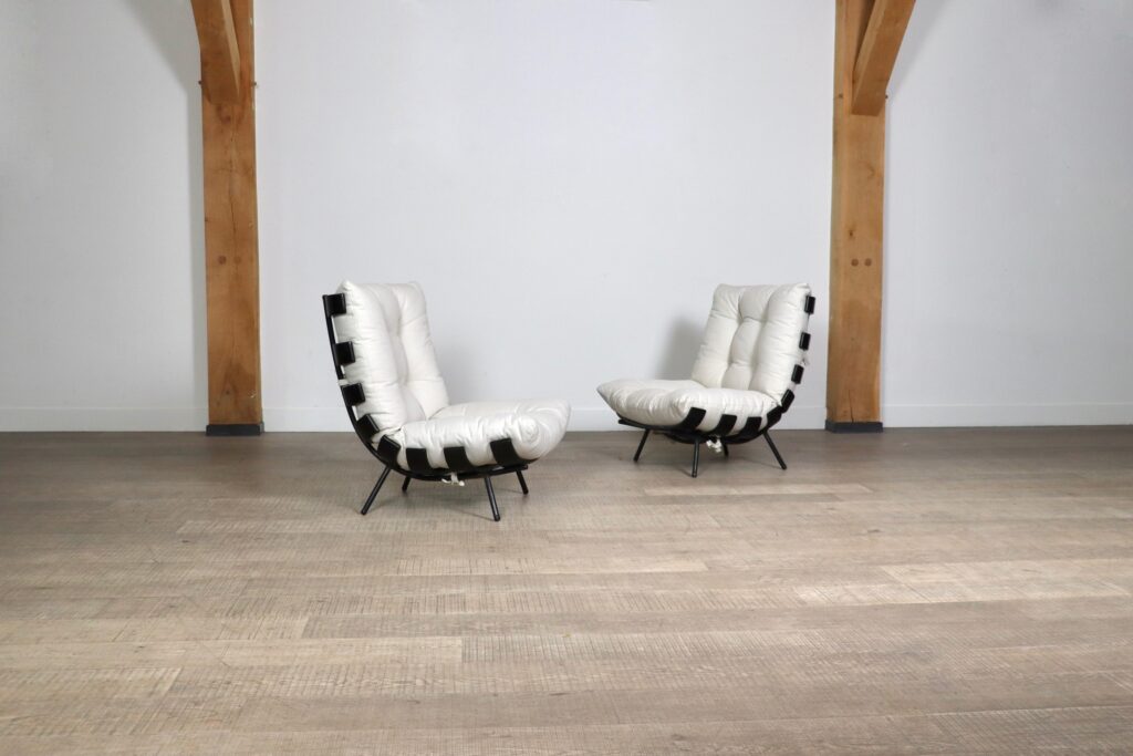 The beautiful ‘Costela’ lounge chairs by Carlo Hauner and Martin Eisler are one of the icons of Brazilian Mid-Century Modern Design. The name ‘Costela’ which translates as rib, is apparent in the design with it’s eight dark stained wooden slats that resemble a rib structure. The slats are rhythmically positioned and curve upwards on the sides. A curved black coated tubular steel frame with short legs and wooden shoes create the necessary support. The nice off-white linen cushions are attached to the backrest and seat by tied strings, gently embraced by the curve on the wood slats’ edge. Create a warm and luxurious ambience with these true design icons!