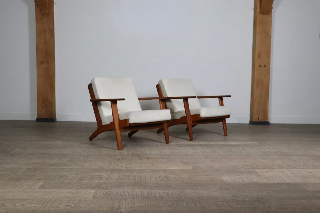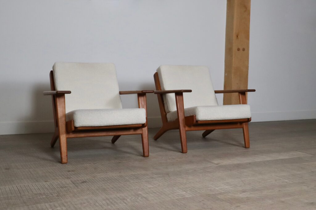 Nice pair of GE290 armchairs by Hans Wegner for Getama, 1950s. Solid oak frame with original sprung cushions newly upholstered in a bouclé fabric to add to the comfort of the design. This model is also known as the “plank chair” referring to the plank shaped armrests. A timeless design to bring in comfort and character into any seating area.