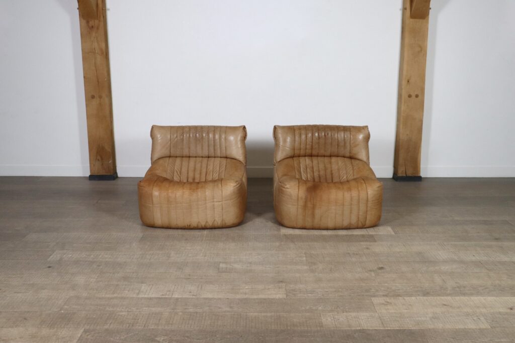 Stunning pair of the rare Aralia lounge chairs in a beautiful original tan leather upholstery, designed by Michel Ducaroy, France 1970s.