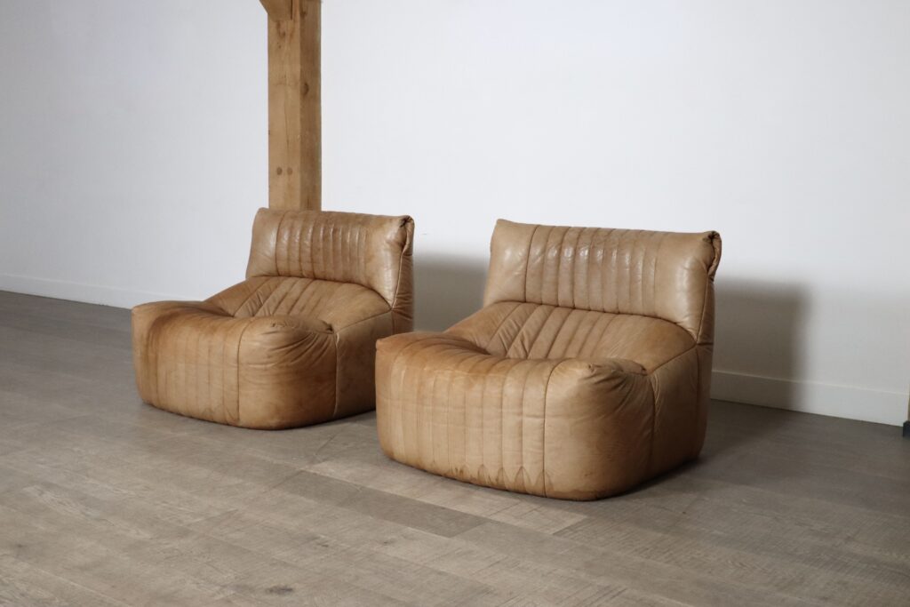 Pair of Ligne Roset Aralia lounge chairs in tan leather by Michel Ducaroy, France 1970s