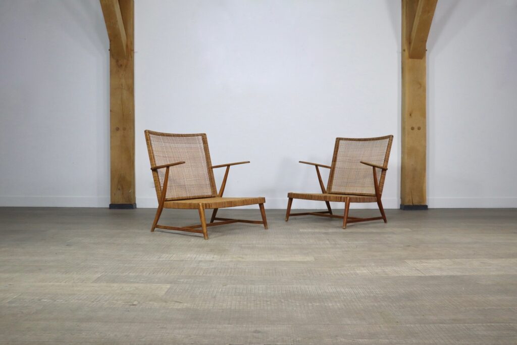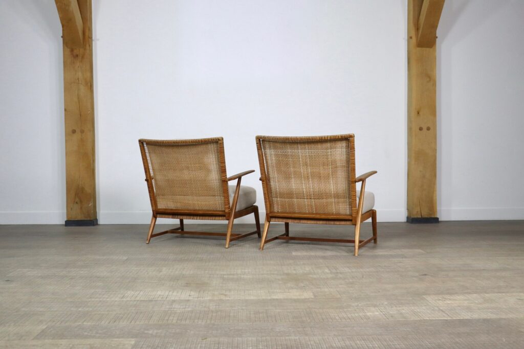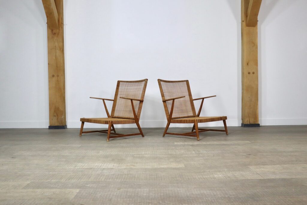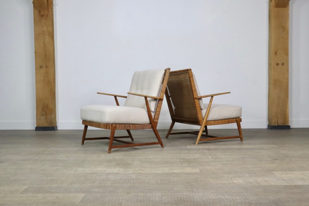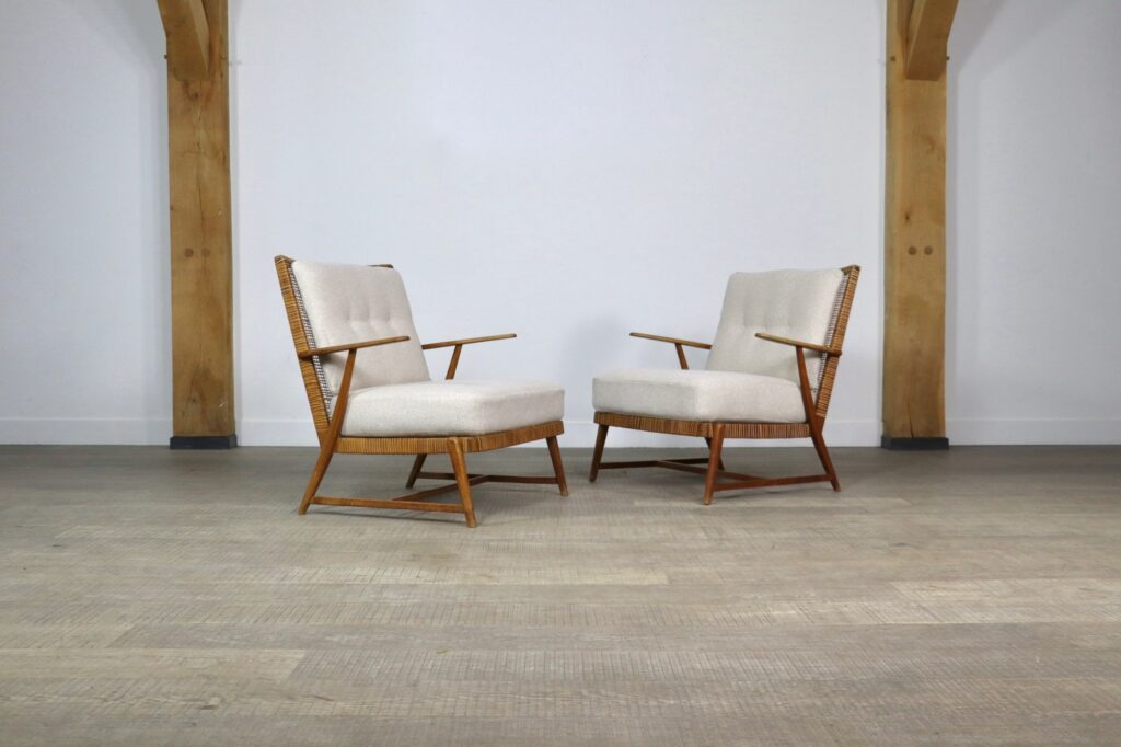 Pair of Midcentury lounge chairs in oak and cane, Germany, 1950s