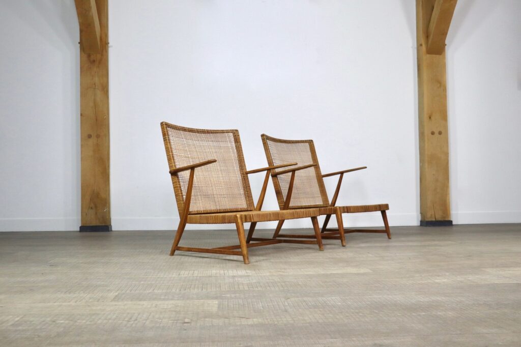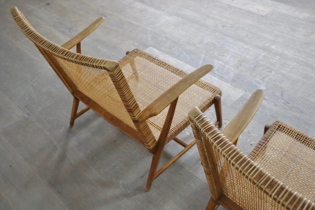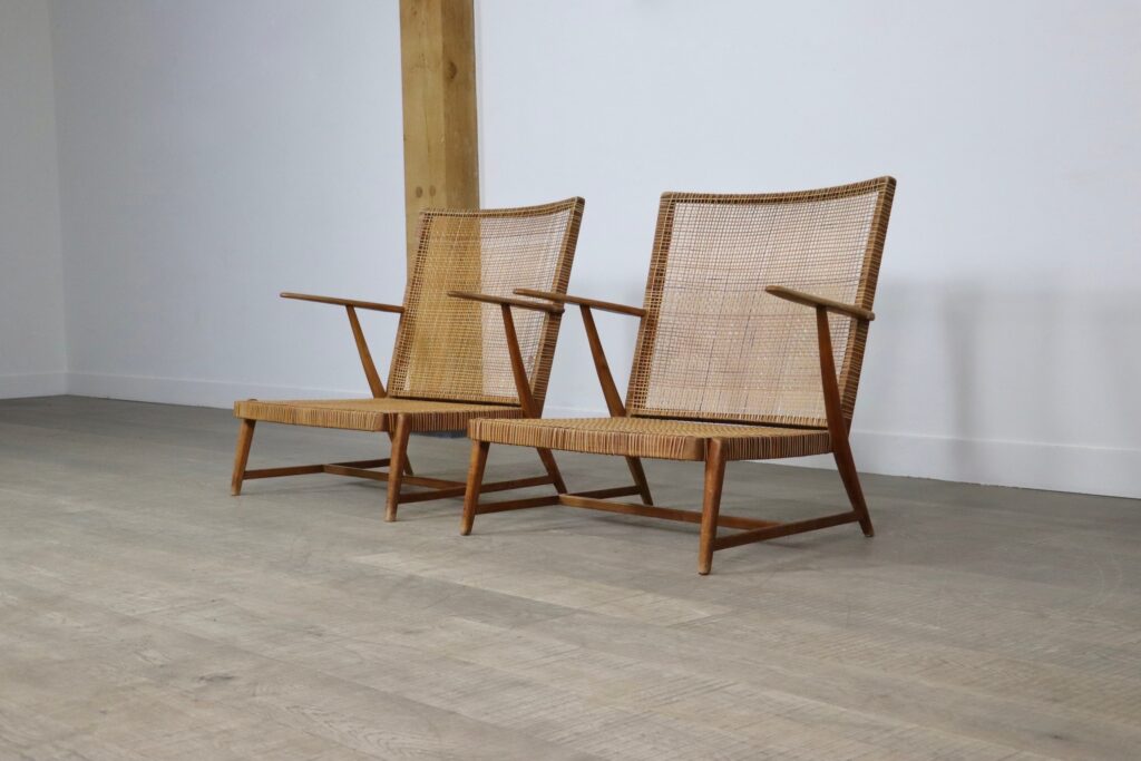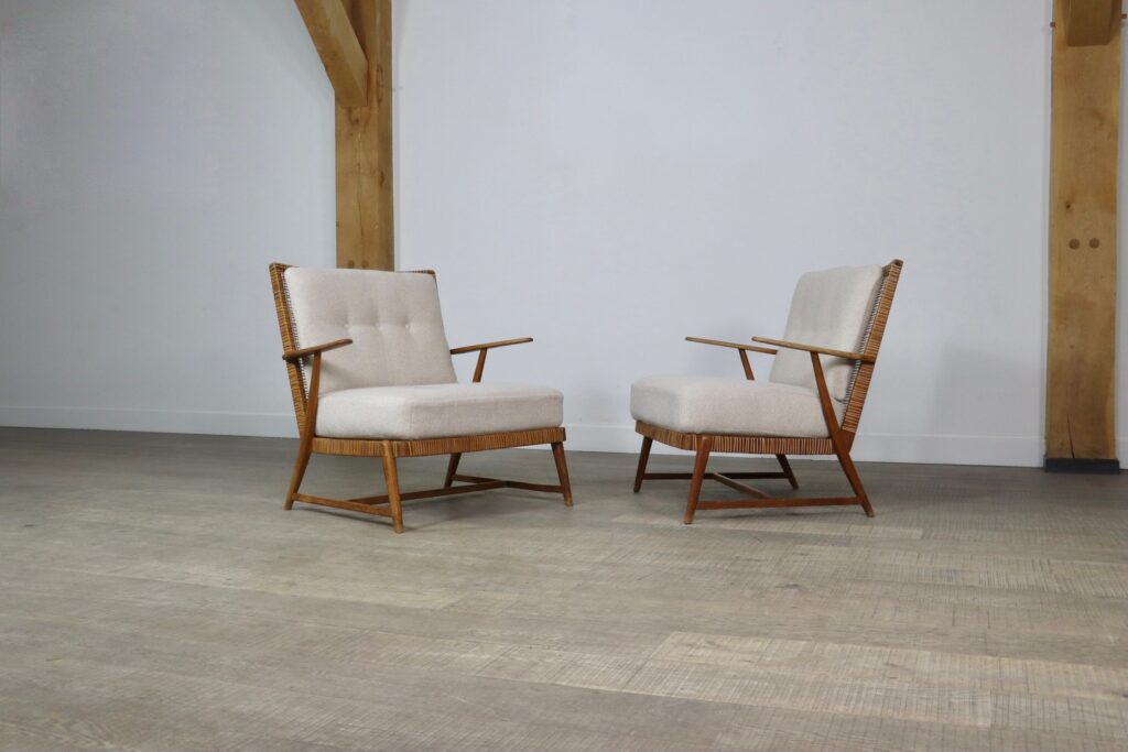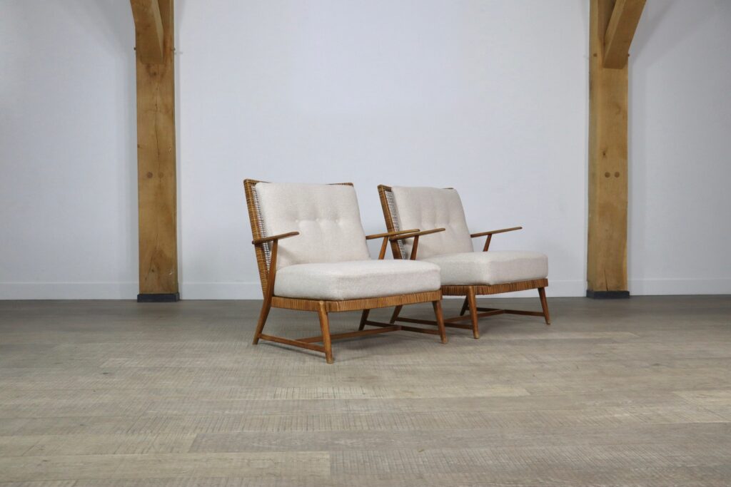 Pair of Midcentury lounge chairs in oak and cane, Germany, 1950s