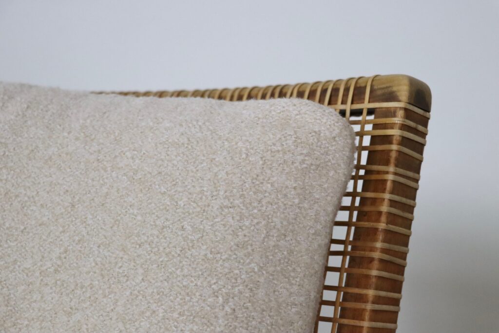 Pair of Midcentury lounge chairs in solid oak wooden frame with woven cane seating and backrest and newly upholstered cushions in a thick, high quality textured cream fabric, Germany 1950s.