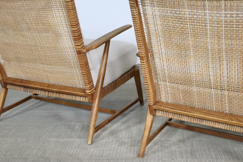 A sophisticated design with minimalist lines and a very low frame. The wide seating with a thick seating cushion gives these chairs a high comfort and support, despite the visually pleasing low design. These unique chairs are one of a kind. The woven cane is in excellent condition. This light and airy design will be a nice touch to any space.