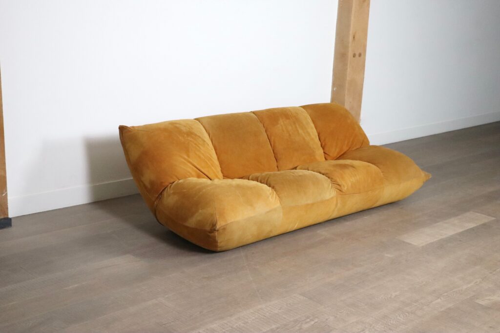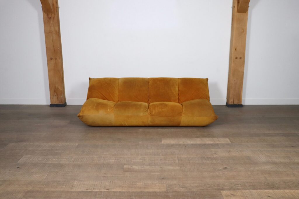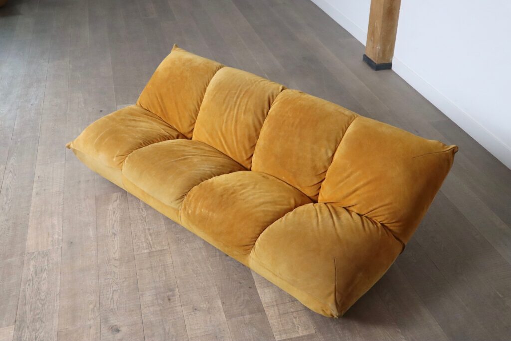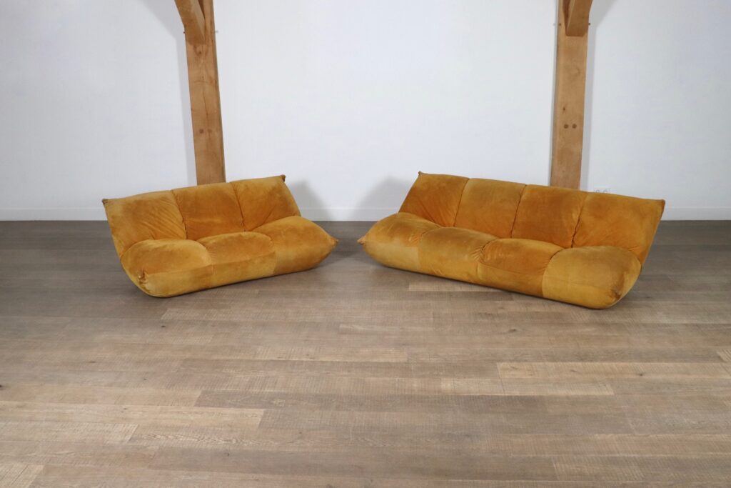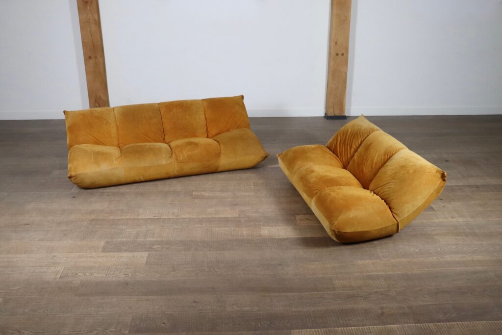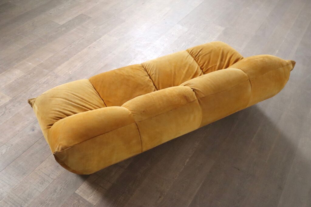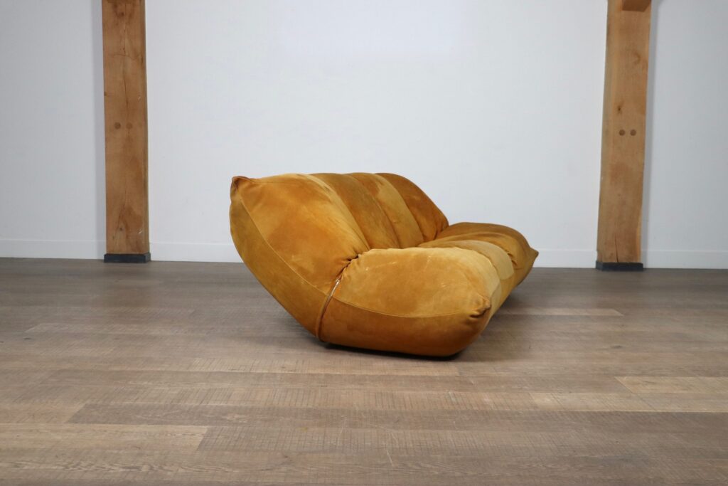 Pair of vintage Papillon sofas in mustard suede by Guido Rosati for Giovannetti, Italy 1970s