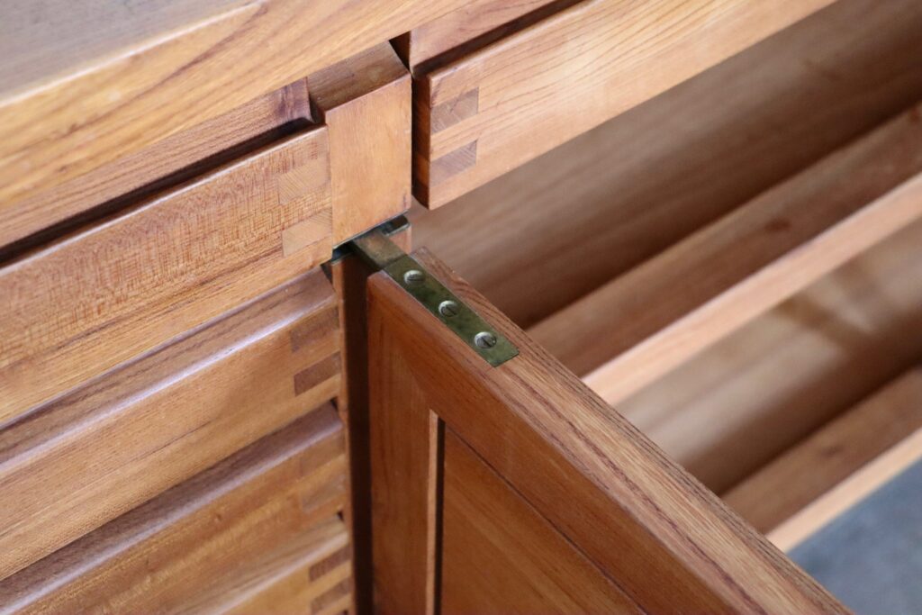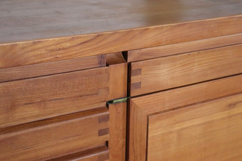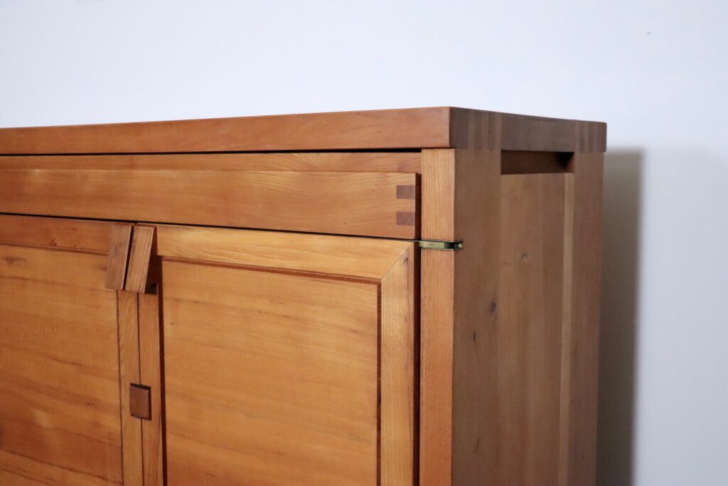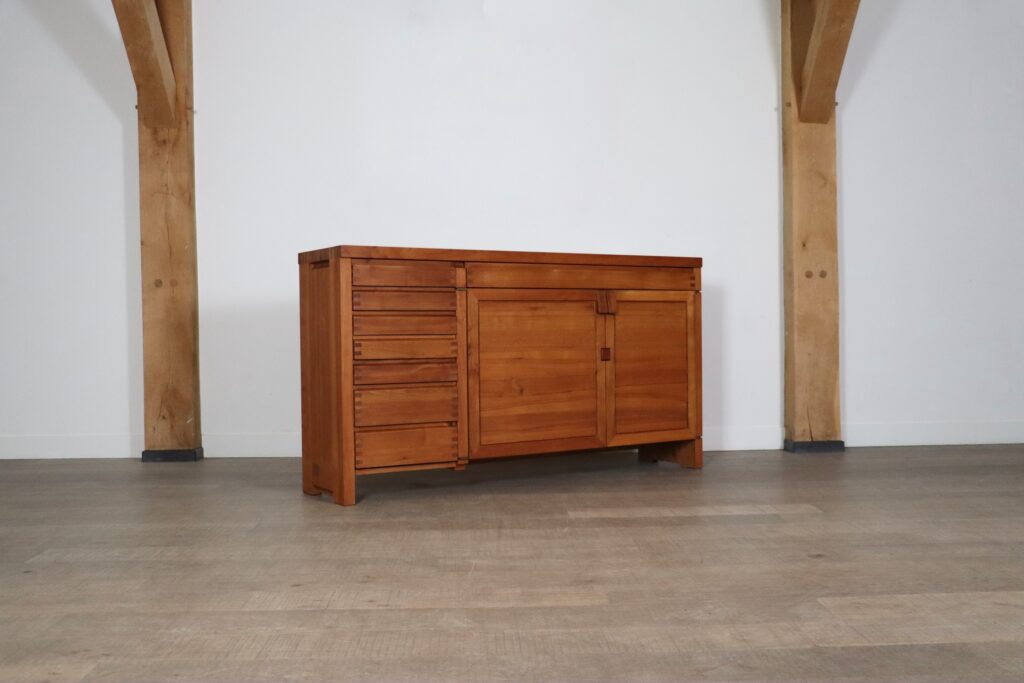 Spectacular sideboard model R13 in solid elm wood and brass details by the French designer Pierre Chapo in the 1960s. Refined with the characteristic wood-joints and beautiful brass hinge details. The R13 sideboard features seven small and one wide drawer and two doors with plenty of storage solutions. An Elegant, refined design which will elevate any space.