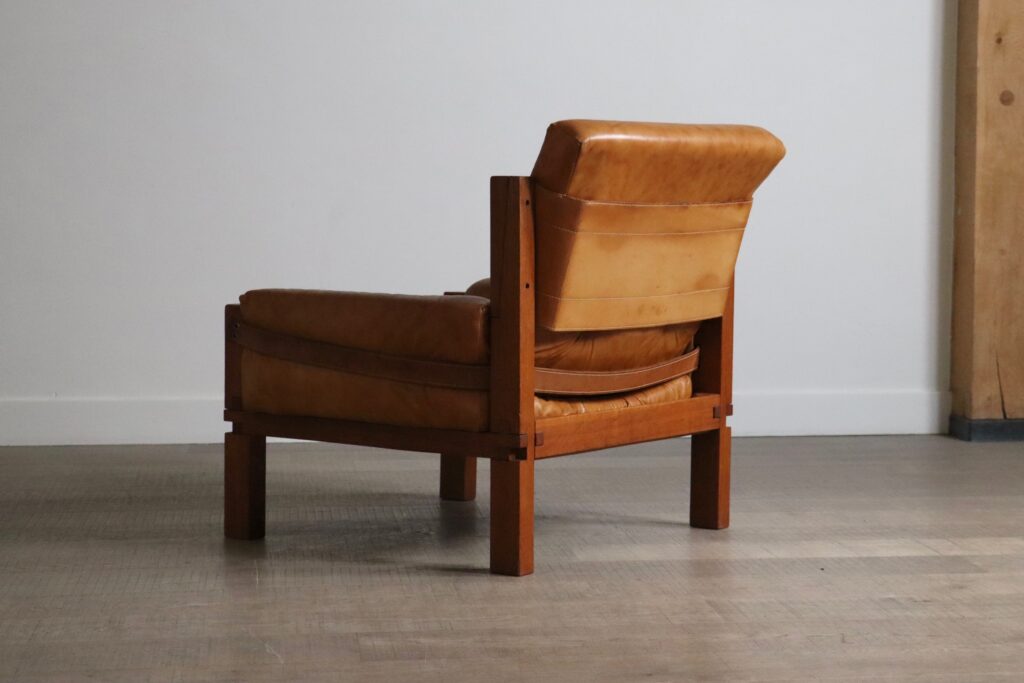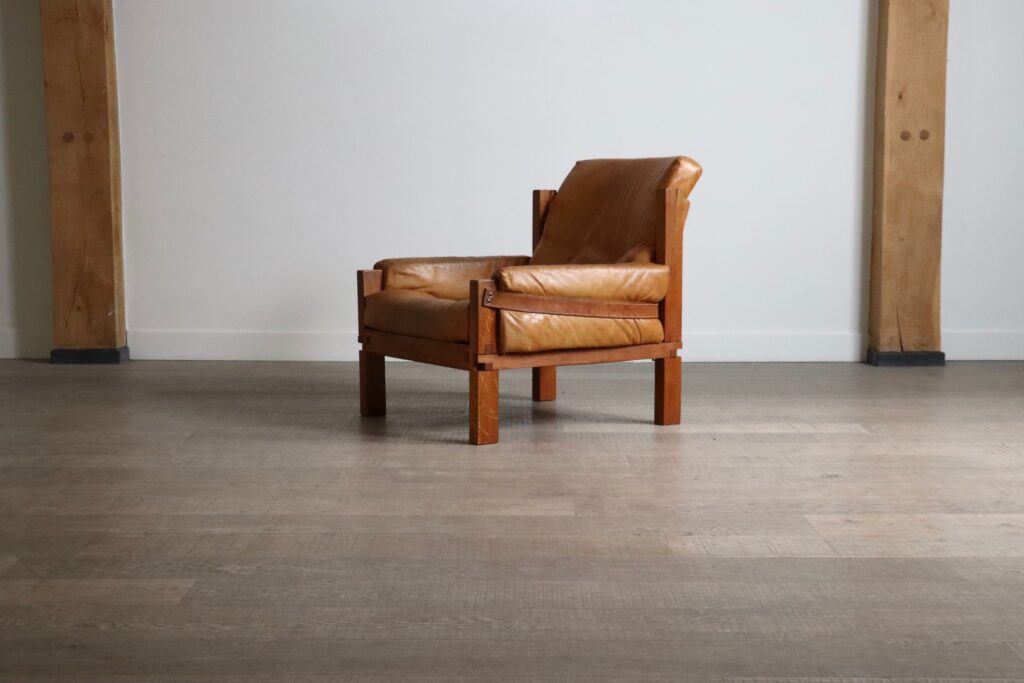 The design of this chair is a great example of following the pioneering 48×72 ratio. A carefully crafted assembly, without the usage of screws. The back is made of one thick saddle leather panel to support the back cushion, also the sides and back have an extra saddle leather strap to support the down filled cushions. The original seating cushions are made of a soft tan leather which features a stunning patina. A well thought design concept to combine both beauty and comfort.