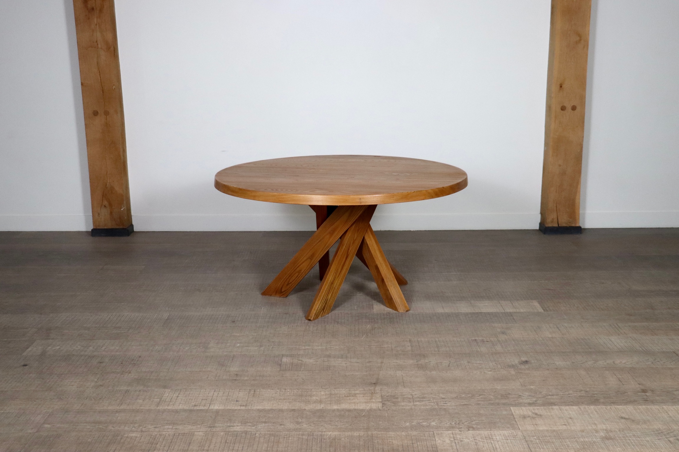 Breathtaking early edition T21D Dining table by renowned French designer Pierre Chapo, crafted in the 1970s in Atelier Chapo from solid elm wood. This iconic round dining table showcase thick, beautifully veined Elm table top and legs, and feature Pierre Chapo’s signature visible joints along the edges, reflecting his mastery of woodworking. The sturdy base, constructed with five angled, crossed legs, ensures exceptional stability while adding a dynamic touch to the design.