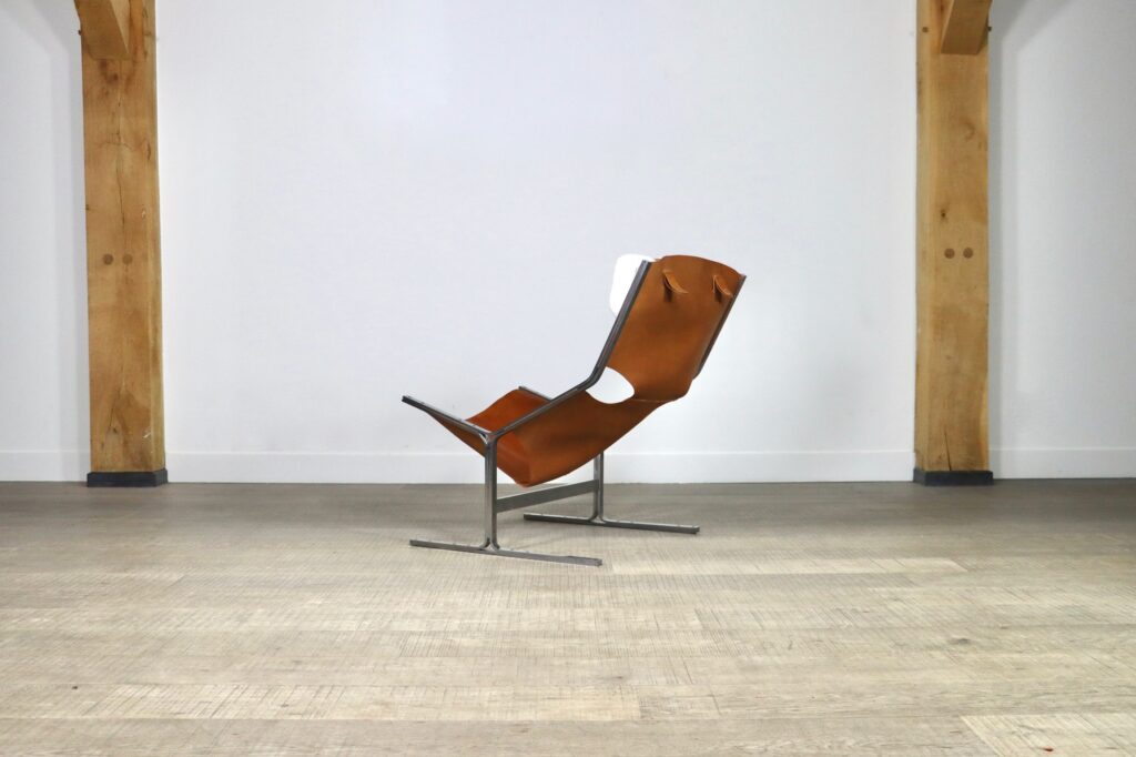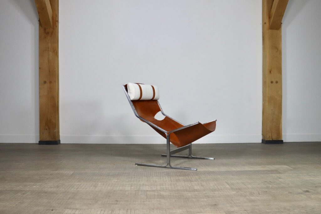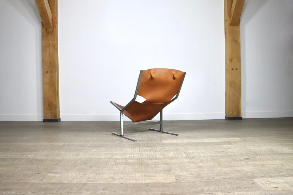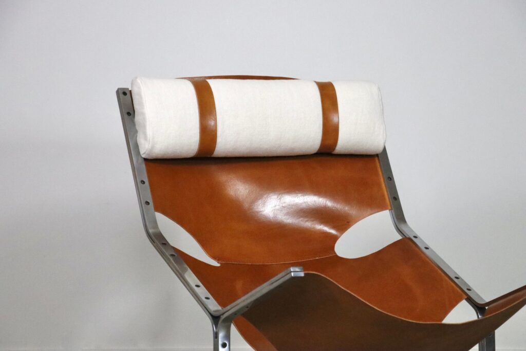 Incredible sling lounge chair designed by Pierre Thielen and sold at Metz & Co, The Netherlands 1960s. The frame is constructed with solid steel, connected by a visually pleasing bolt connection, similar to Poul Kjaerholm’s designs. This detail makes the frame construction a visually pleasing part of the design. The cognac saddle leather seat is attached within this frame and provides great support. The shapes of the cut-out provide comfort and shape to the leather to provide great support. The newly upholstered head cushion in a beautiful cream colored fine linnen fabric gives the chair additional comfort and a nice look. As this chair was expensive to be made, it was not produced in great numbers, making it a rare find. Besides its stunning design, this chair is highly comfortable.