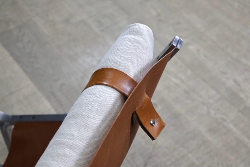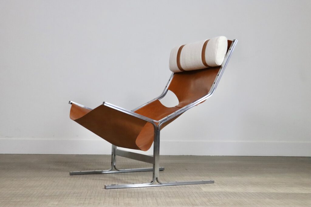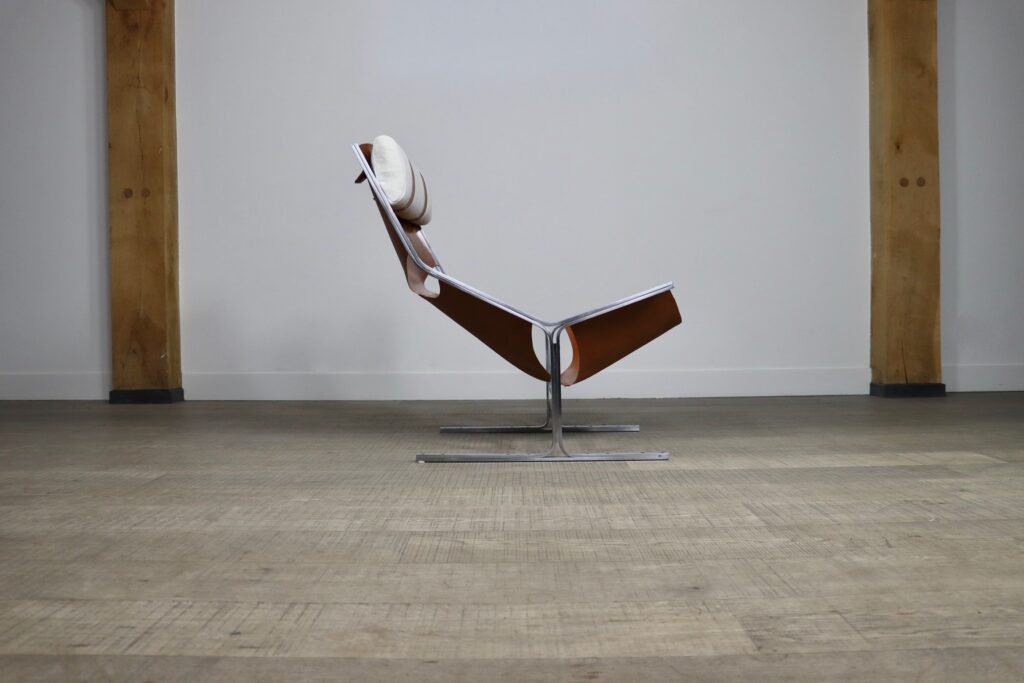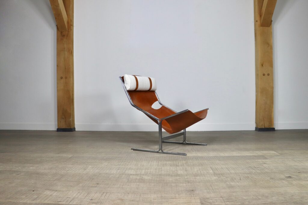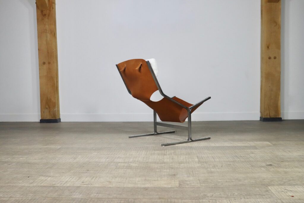 Incredible sling lounge chair designed by Pierre Thielen and sold at Metz & Co, The Netherlands 1960s. The frame is constructed with solid steel, connected by a visually pleasing bolt connection, similar to Poul Kjaerholm’s designs. This detail makes the frame construction a visually pleasing part of the design. The cognac saddle leather seat is attached within this frame and provides great support. The shapes of the cut-out provide comfort and shape to the leather to provide great support. The newly upholstered head cushion in a beautiful cream colored fine linnen fabric gives the chair additional comfort and a nice look. As this chair was expensive to be made, it was not produced in great numbers, making it a rare find. Besides its stunning design, this chair is highly comfortable.