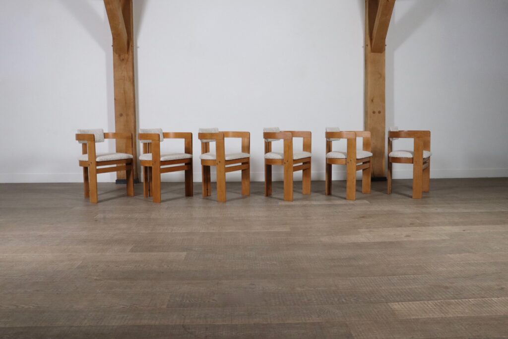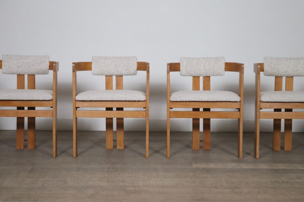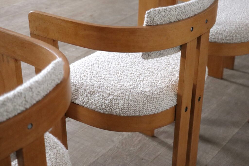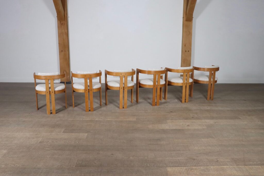 Beautiful set of six vintage dining chairs model Pigreco by Afra and Tobia Scarpa, Italy 1960s. The nice ash bent-wood frame with nice padded seating and back cushions reupholstered in a high quality bouclé remind of the iconic Pamplona design of Augusto Savini. The beautiful combination of the light warm wooden tones of the frame and soft bouclé seat and back cushions give a warm and cozy feeling to your dining area. A nice and comfortable design to enable long dining sessions in comfort and have the family or friends together.