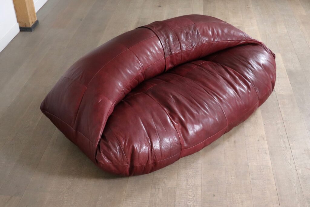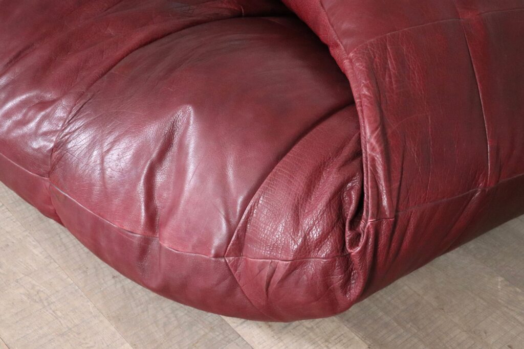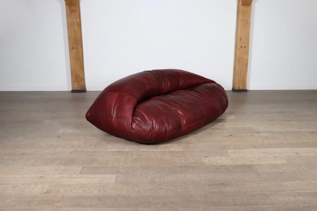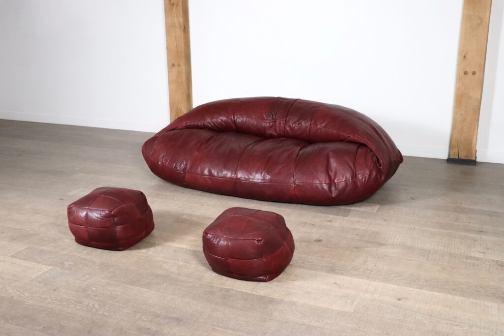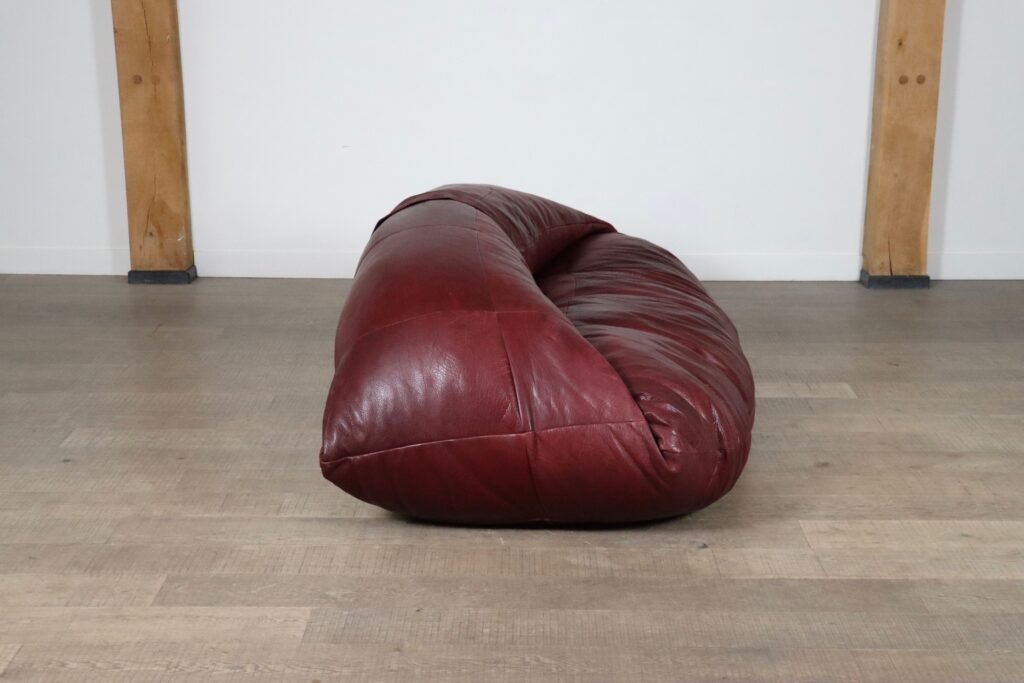 A bespoke piece, which was made to order in the 1970s, in low numbers, which makes it a rare find. This unique sofa has an incredible folded shape, and due to it being fully foam filled it is extremely comfortable and cosy. Also coming with two original matching poufs, where you can rest your feet on. The upholstery is its original thick full grain burgundy leather which is in excellent condition. The beautiful grain on this leather gives the sofa its luxurious feel and character. A true iconic piece which will elevate any room with character.