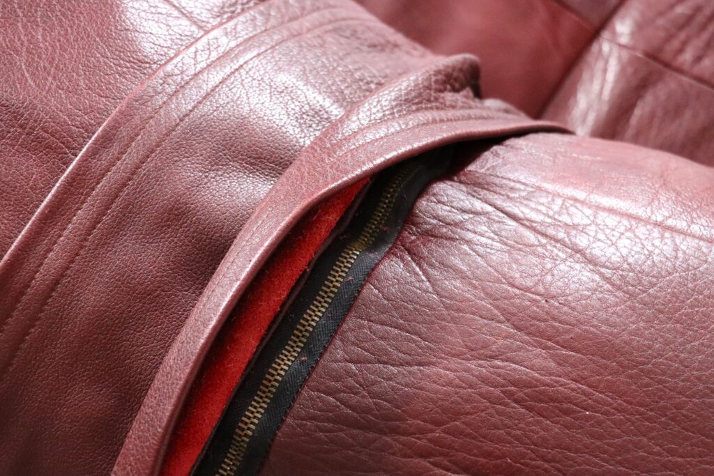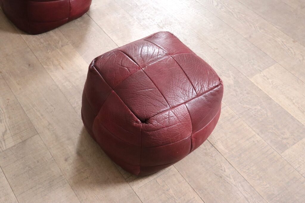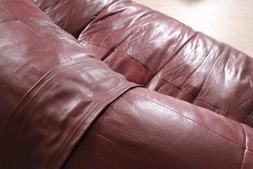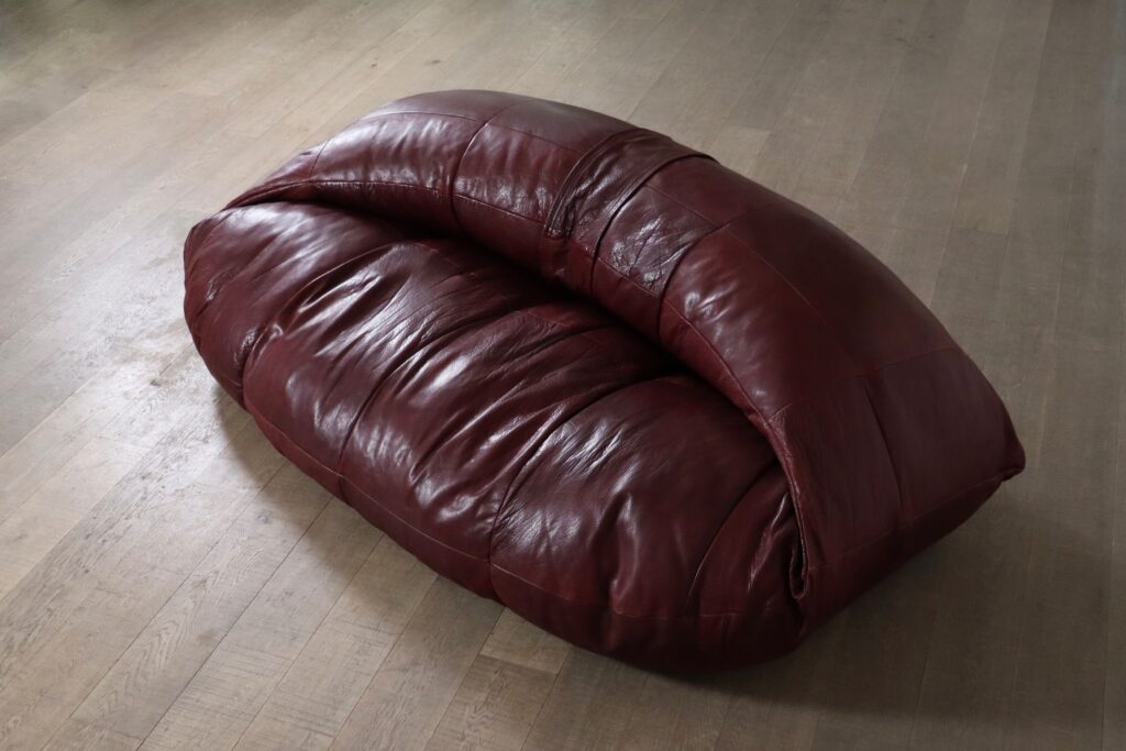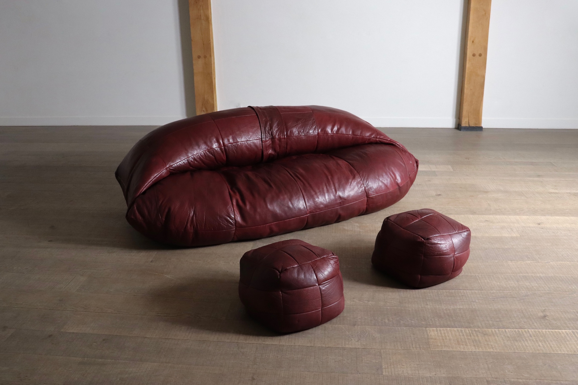 A bespoke piece, which was made to order in the 1970s, in low numbers, which makes it a rare find. This unique sofa has an incredible folded shape, and due to it being fully foam filled it is extremely comfortable and cosy. Also coming with two original matching poufs, where you can rest your feet on. The upholstery is its original thick full grain burgundy leather which is in excellent condition. The beautiful grain on this leather gives the sofa its luxurious feel and character. A true iconic piece which will elevate any room with character.