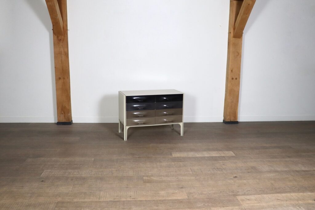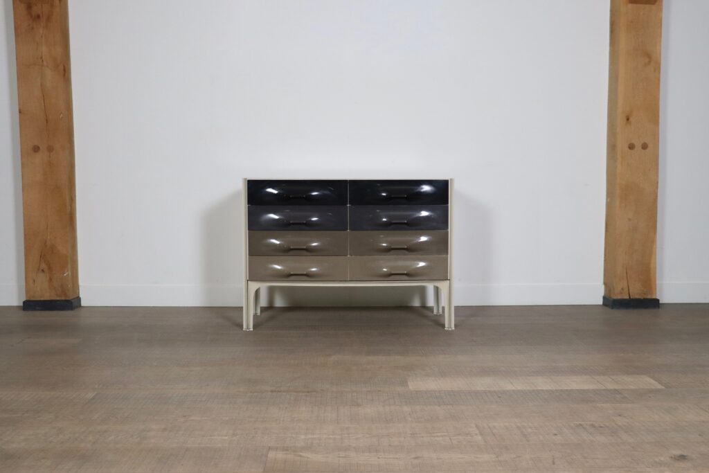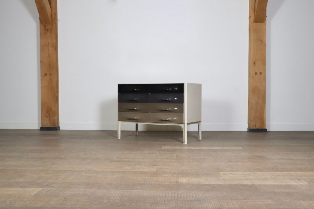 Nice cabinet from the X-line series by renowned designer Raymond Loewy for Dubinsky Frères, France 1968. A space age icon featuring plastic, which was groundbreaking for its time. The molded plastic drawers have gradient color pattern from black to a softer grayish/beige color. This combination provides a dynamic look to this design in combination with the flowing shaped drawers. Raymond Loewy is known as the father of American industrial design and is credited with inventing the American “streamline” aesthetic. Loewy’s creations are still well known today such as his collaborations with Lotus, Shell, Coca Cola and Nasa.